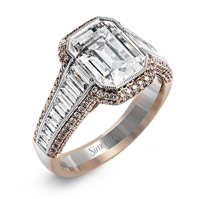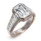 This 18k white and rose gold ring has a clean, graduated design with .84 ctw of baguette diamonds leading up to the center stone. The edges are bordered by .49 ctw of pink diamonds set into rose gold.