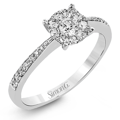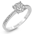 This delightful ring is crafted from 18k white gold and features a .30 ct white diamond in the center of .50 ctw of smaller round white diamonds.