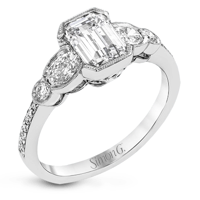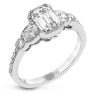 This lovely contemporary design features white gold and .16 ctw of round white diamonds and .39 ctw of oval shaped white diamonds as well as delicate milgrain edging around its centerpiece.