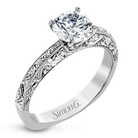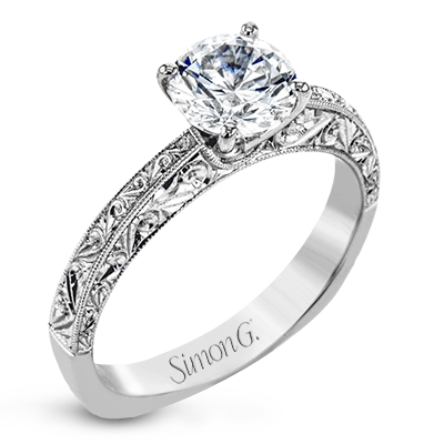 Beautiful in its simplicity, this sleek white gold ring accentuates its centerpiece with delicate engraved details on either side.