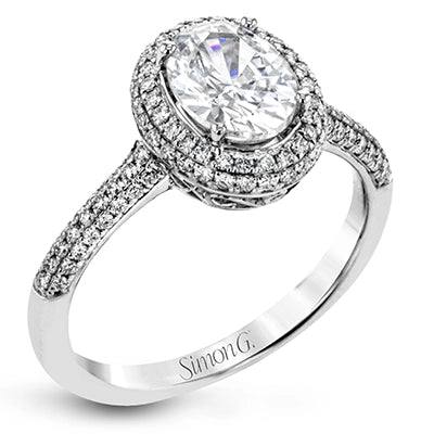 Classic and elegant, this white gold ring sparkles with .40 ctw of round white diamonds framing its oval shaped centerpiece.