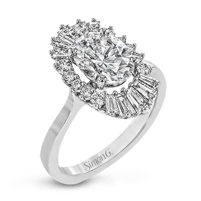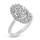 This stunning 18K WG engagement ring is inspired by a ballerinas skirt and features 0.21 ctw RD diam and 0.62 ctw of baguettes, surrounding the center