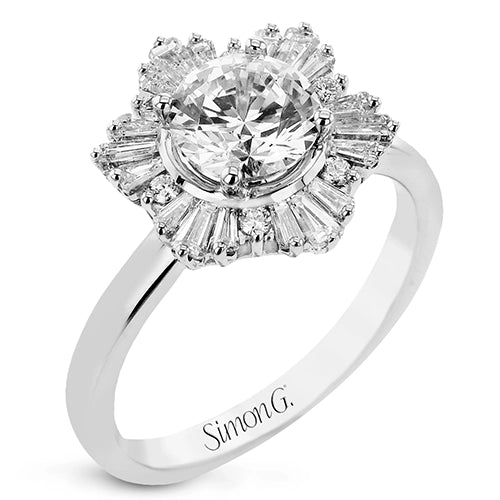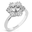 Crafted in 18K polished white gold, this distinctive ring features a halo of round diamonds 0.7 ctw, surrounded by a burst of baguette shaped diamonds 0.45 ctw.