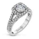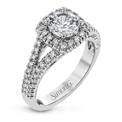This elegant, contemporary design in white gold sparkles with .45 ctw of round white diamonds in its halo and split shank.