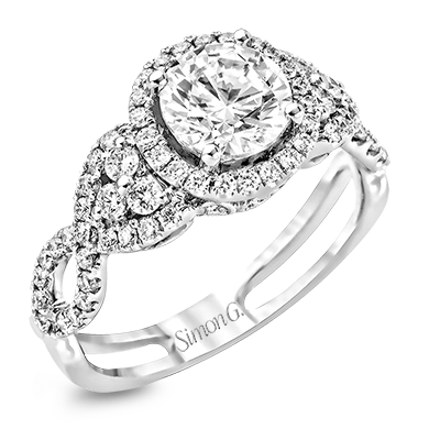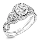 Reflecting an intricate modern design, this remarkable white gold ring is emphasized by a lovely halo complemented with .59 ctw round cut white diamonds.