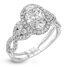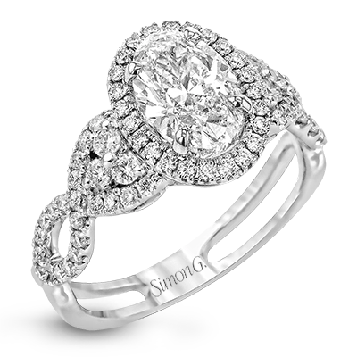 Reflecting an intricate modern design, this remarkable white gold ring is emphasized by a lovely halo complemented with .59 ctw round cut white diamonds.