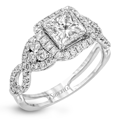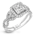 Reflecting an intricate modern design, this remarkable white gold ring is emphasized by a lovely halo complemented with .59 ctw round cut white diamonds.