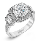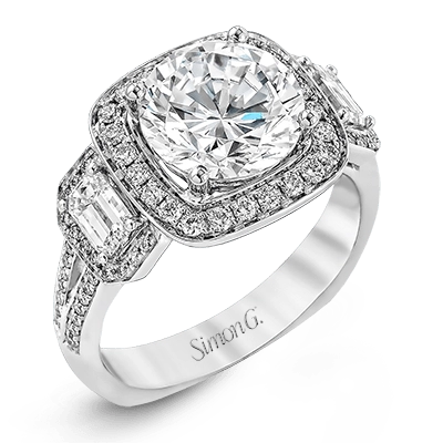 Featuring an impressive modern design, this white gold ring features .53 ctw emerald cut stone sides and .46 ctw round cut white diamonds.