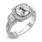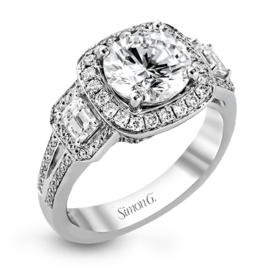 The dazzling contemporary design of this white gold engagement ring is emphasized by .44 ctw round cut white diamonds and .45 ctw emerald cut white diamonds.