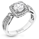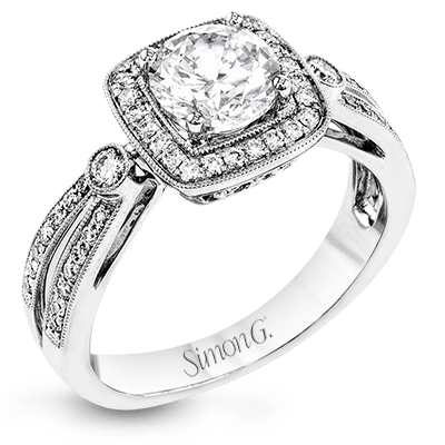 This wonderful 18k white gold ring has a distinctive design with a soft square halo and .34 ctw of white diamonds.