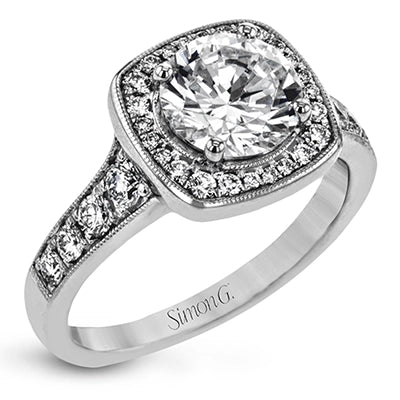 This exquisite white gold ring features a square halo and milgrain detail along with .49 ctw of round white diamond accents.