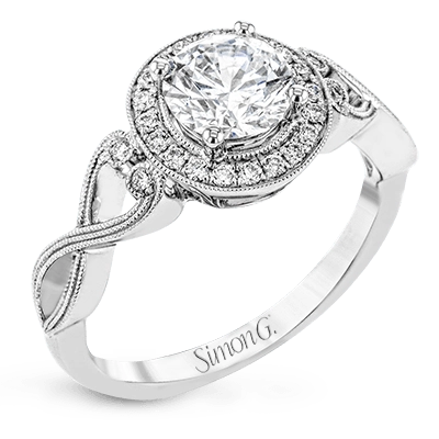 This remarkably beautiful white gold ring features intricate milgrain details alongside a lovely halo of .06 ctw of round white diamonds.