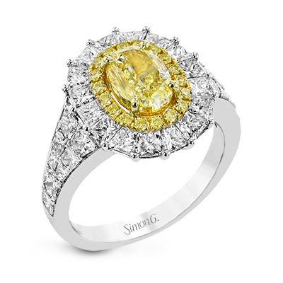 This very special ring is custom crafted for a 1.34 ct oval yellow diamond at the center. This stone is then surrounded by an inner halo of round yellow diamonds and a larger outer halo of princess cut white diamonds.