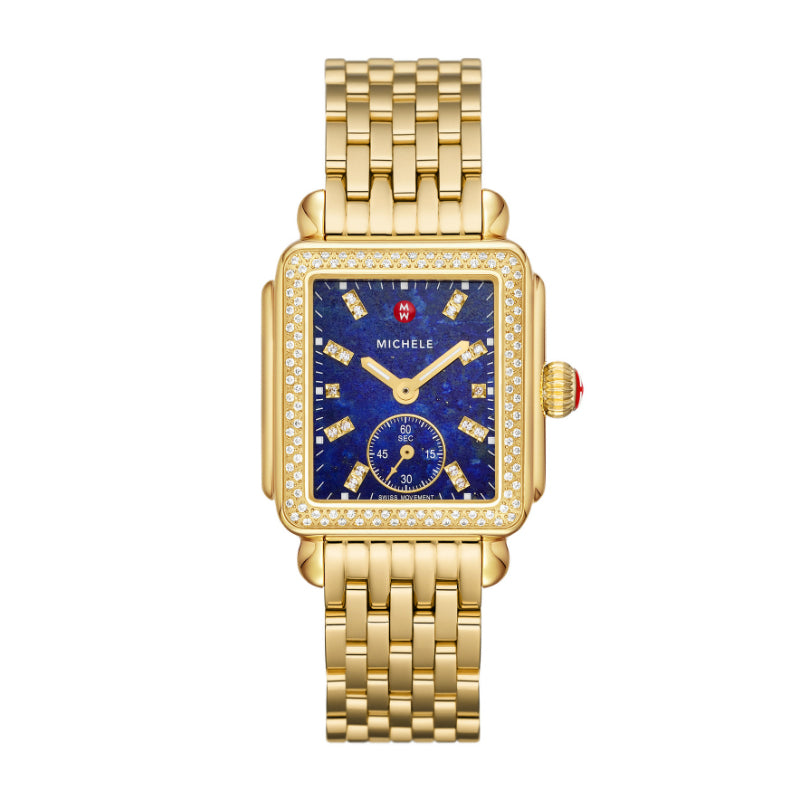 Inspired by the geometric shapes of Art Deco architecture, this 18K gold-plated Deco Mid shines with 126 brilliant hand-set diamonds (0.57 carat weight) on the bezel and atop the lapis dial adorned with double diamond hour markings and our signature MICHELE crown. This stunning timepiece features a Swiss movement and our signature seven-link 18K gold-plated stainless and 18K gold-plated bracelet that is interchangeable with any 18mm MICHELE strap.