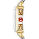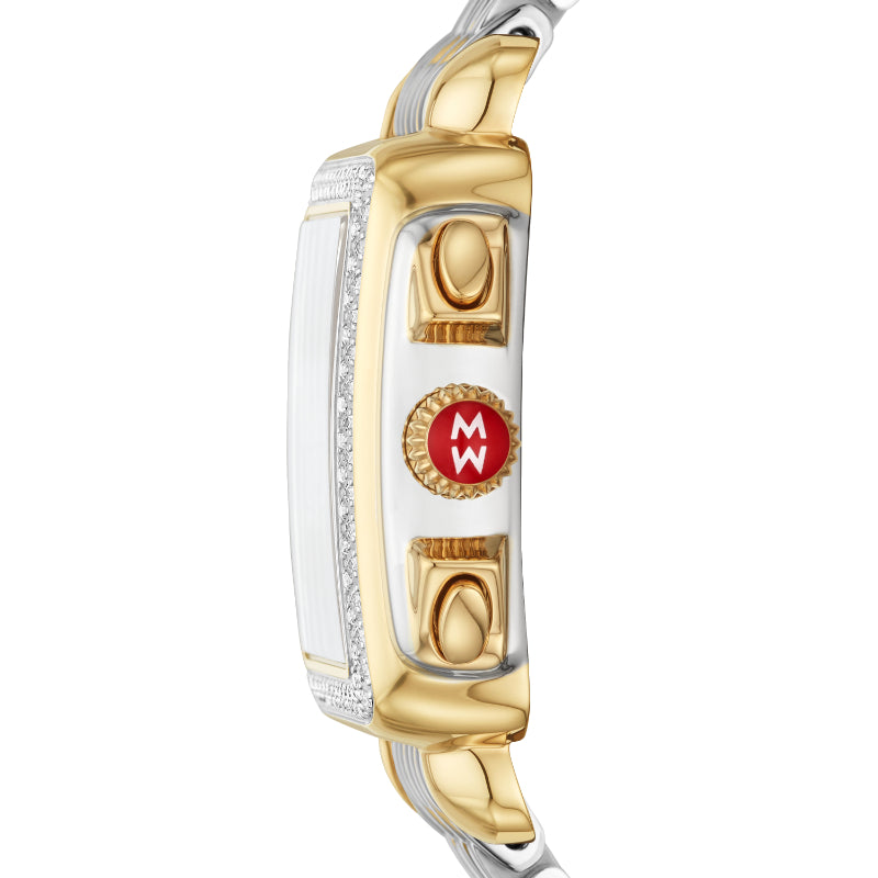 The rectangular case of the Deco two-tone 18K gold diamond watch reflects the geometric shapes identified with Art Deco architecture. This iconic Swiss chronograph timepiece features 120 brilliant hand-set diamonds (0.6 carat weight) along the bezel and mother-of-pearl dial, three subeyes accented with gold foil and engraved MICHELE logos within the case walls. A two-tone 18k gold plated seven-link bracelet adds the finishing touch and is interchangeable with any 18mm MICHELE strap.