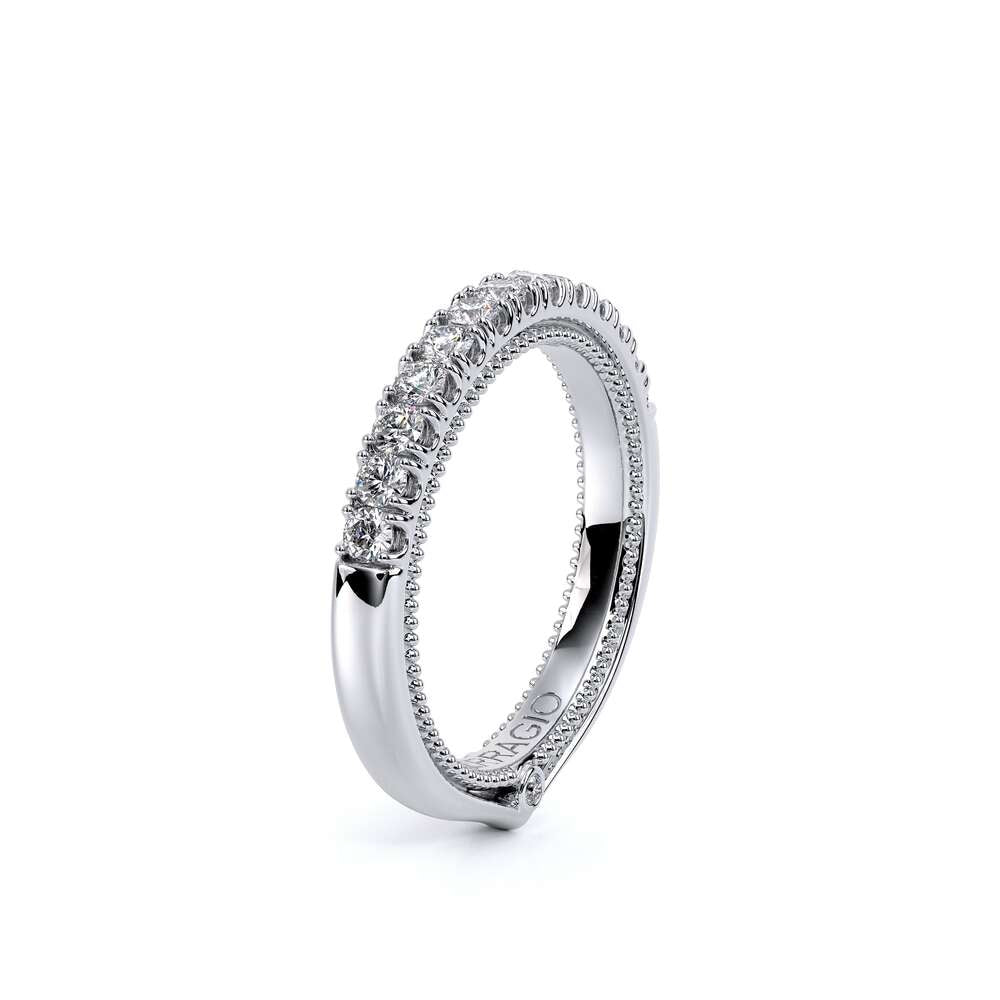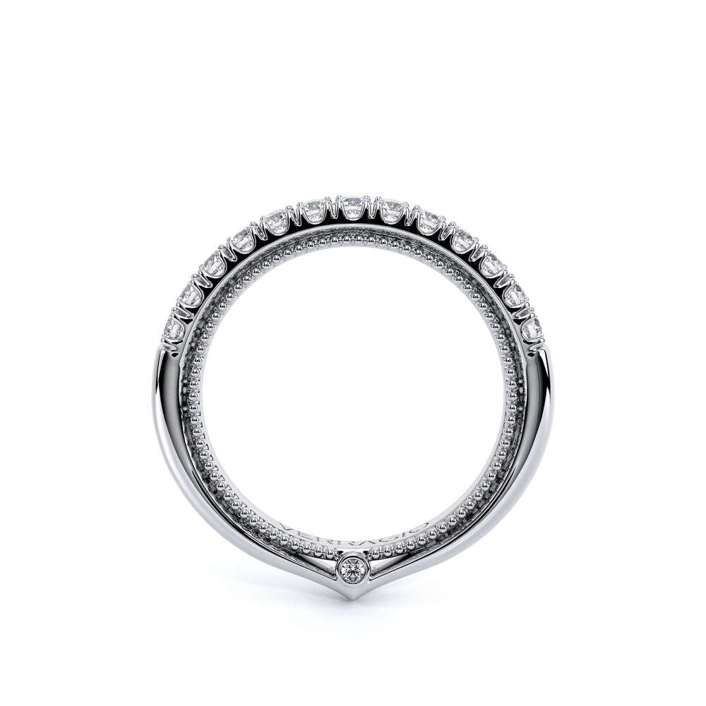 COUTURE-0418W Classic Wedding band, pave with round brilliant diamonds, featuring full Signature Beading profile, completed with the Couture pointed shank and Verragio Bezel immersed.