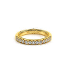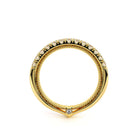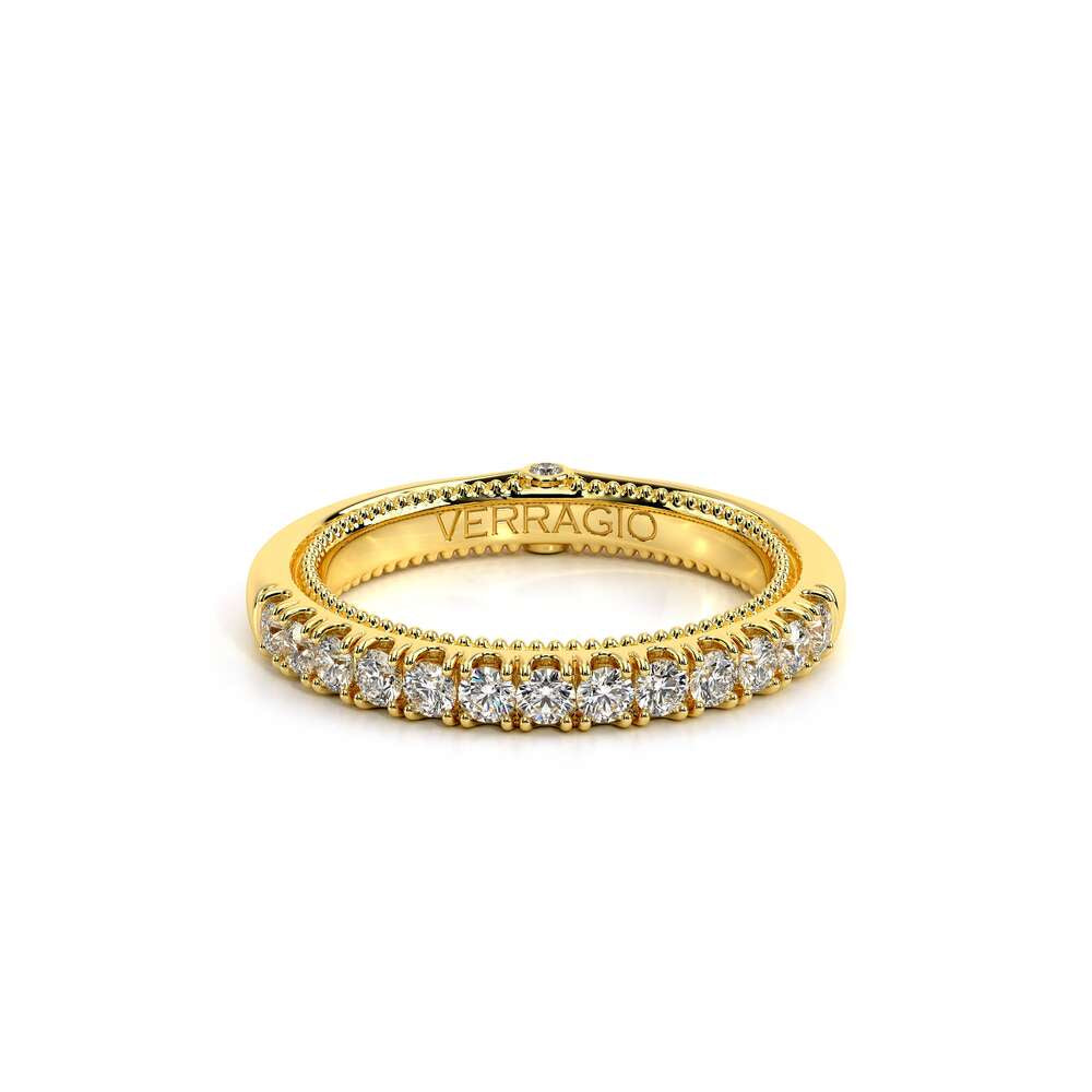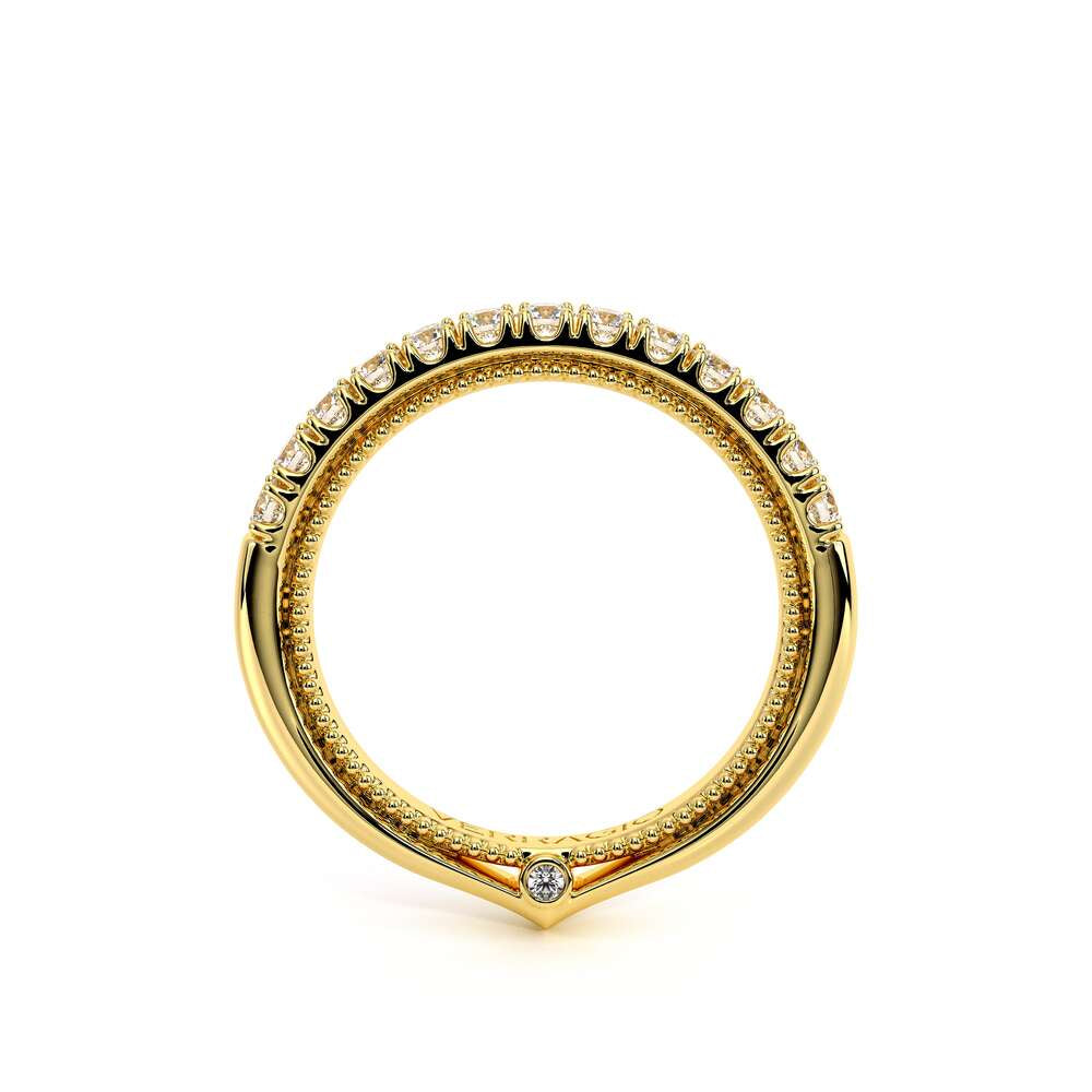 COUTURE-0418W Classic Wedding band, pave with round brilliant diamonds, featuring full Signature Beading profile, completed with the Couture pointed shank and Verragio Bezel immersed.