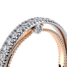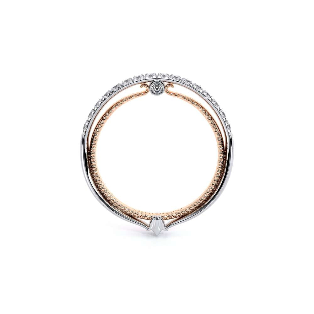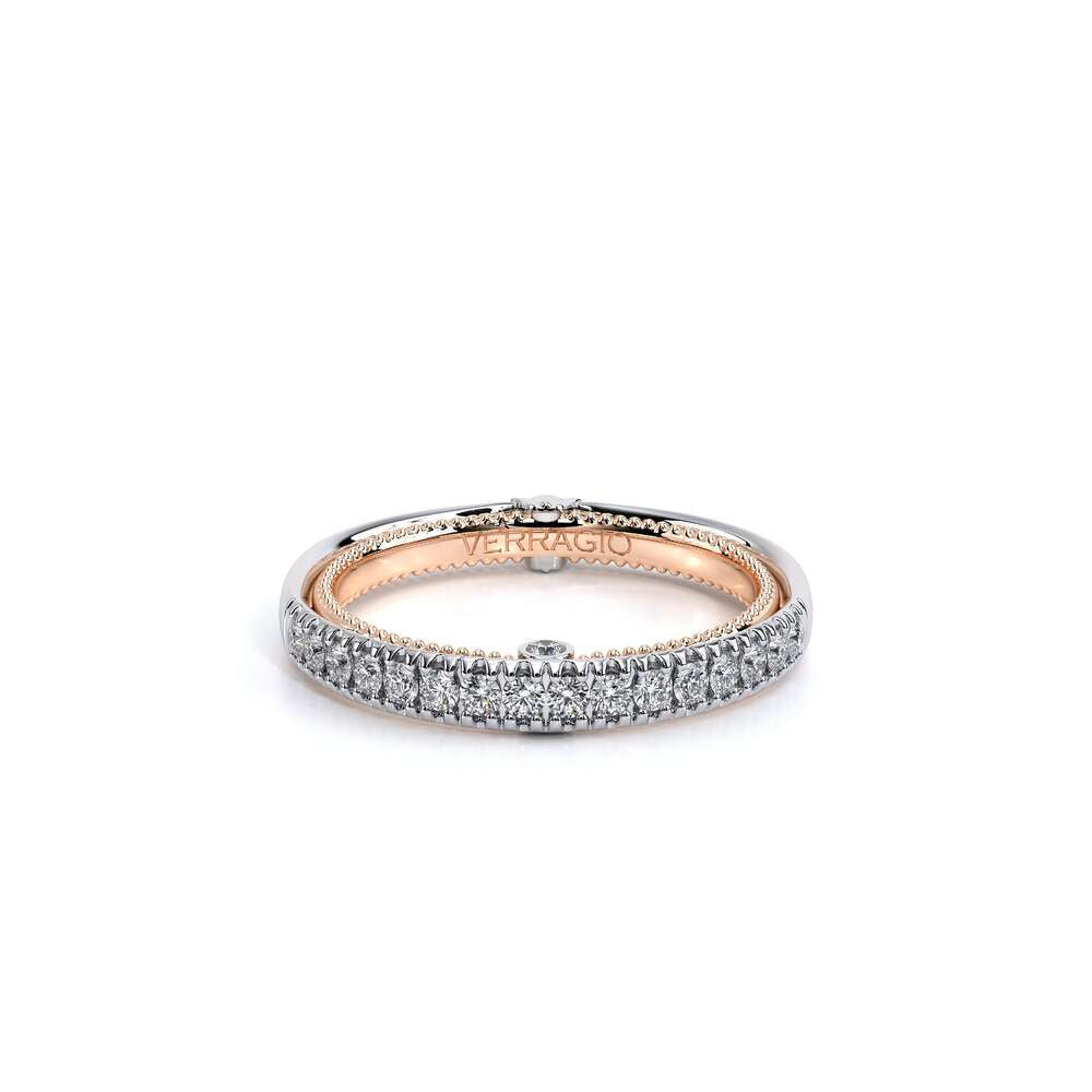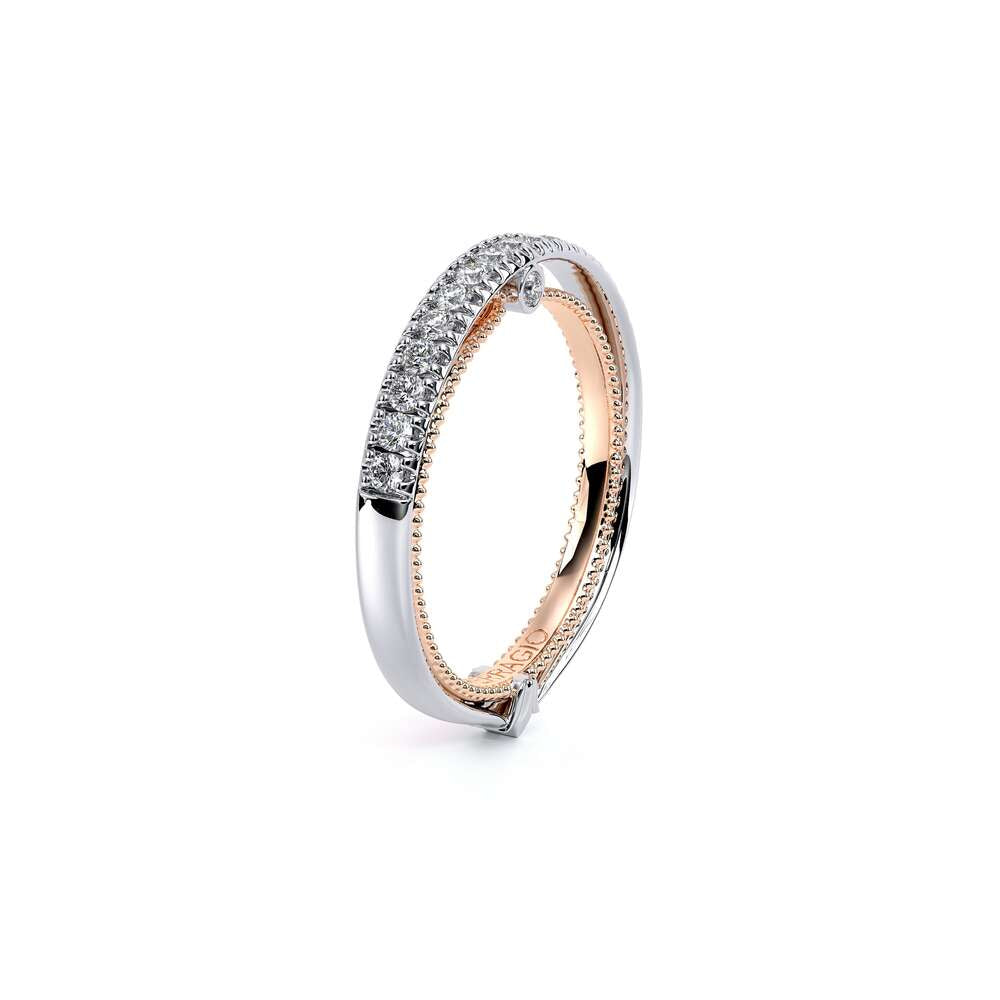 COUTURE-0429W Dazzling Wedding band pave with round brilliant diamonds, featuring the Verragio Bezel Set and upward Scrollwork Signature Beading profile, completed with the Couture pointed shank.