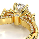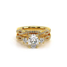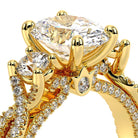 COUTURE-0450OV Timeless Twist Oval three stone Engagement ring that features a pave set cathedral diamond band, the subtle sparkle of our half diamond Riviera, adorned with the Verragio Crest and our Verragio Signature Beading, completed with the Couture shank.