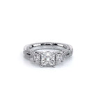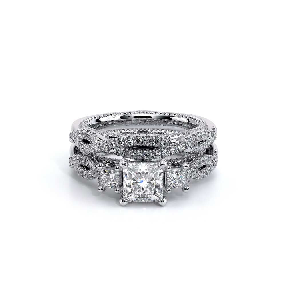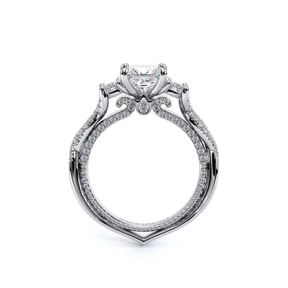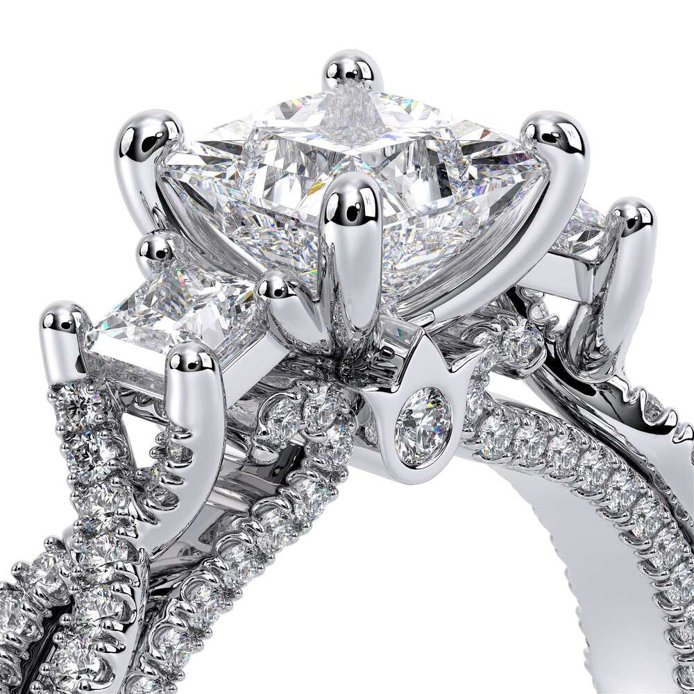 COUTURE-0450P Timeless Twist Princess three stone Engagement ring that features a pave set cathedral diamond band, the subtle sparkle of our half diamond Riviera, adorned with the Verragio Crest and our Verragio Signature Beading, completed with the Couture shank.