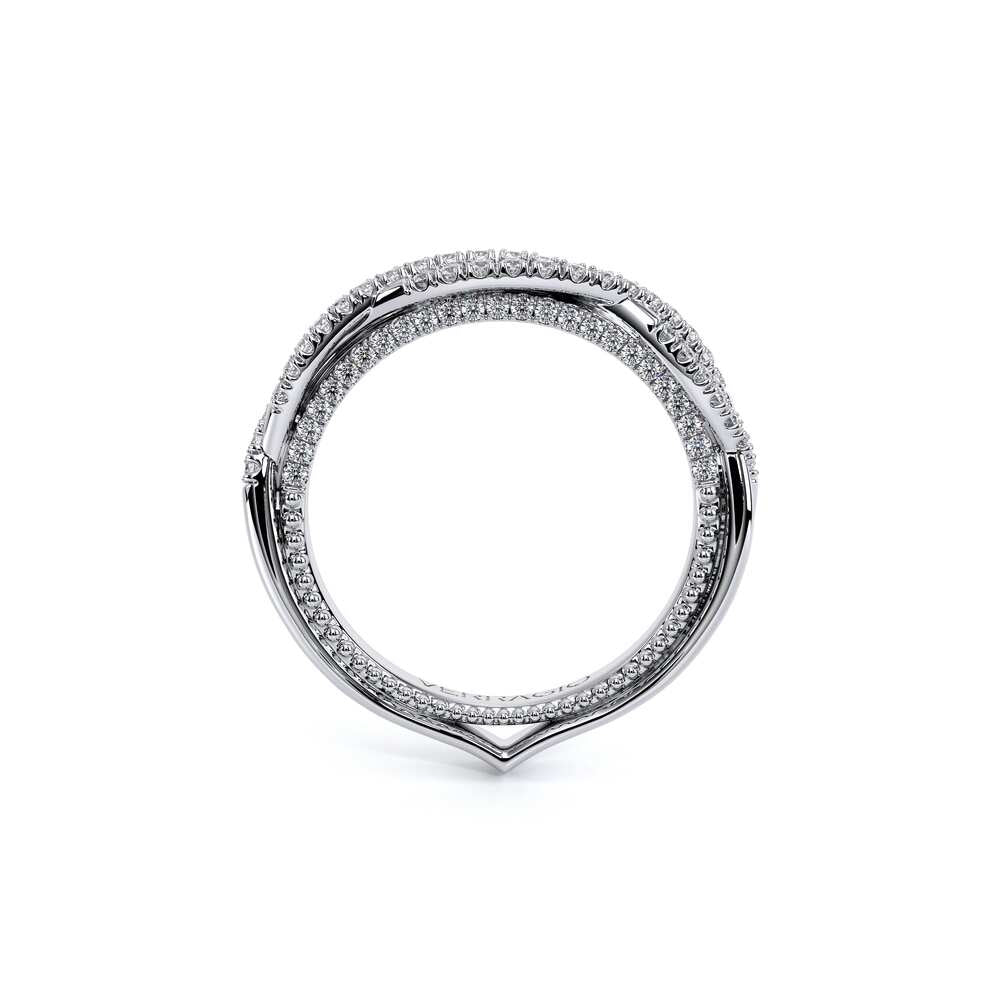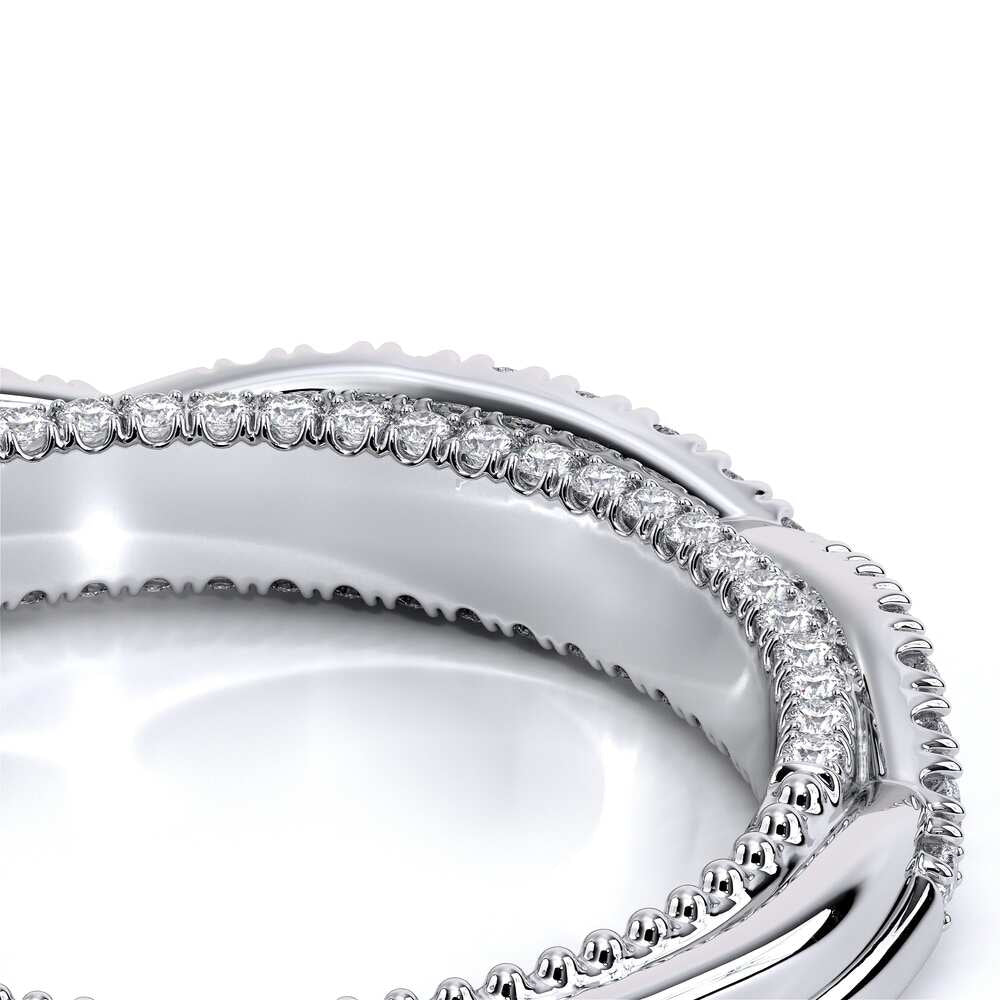 COUTURE-0450W Elegant Twist Wedding band pave with round brilliant diamonds, featuring Half Diamond Riviera-Signature Beading profile, completed with the Couture pointed shank.
