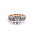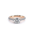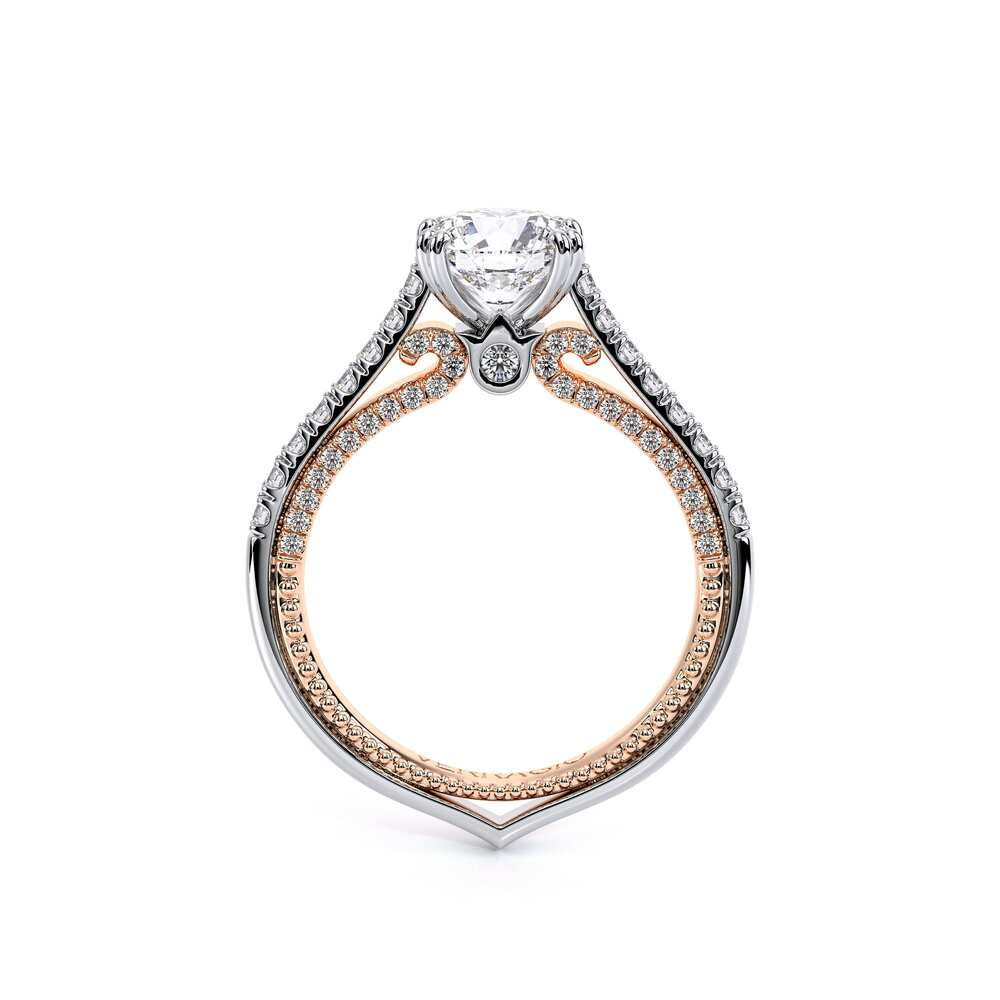 COUTURE-0452R Classically simple Round Engagement ring that features a pave set cathedral diamond band, the subtle sparkle of our half diamond Riviera, adorned with the Verragio Crest and our Verragio Signature Beading, completed with the Couture shank.