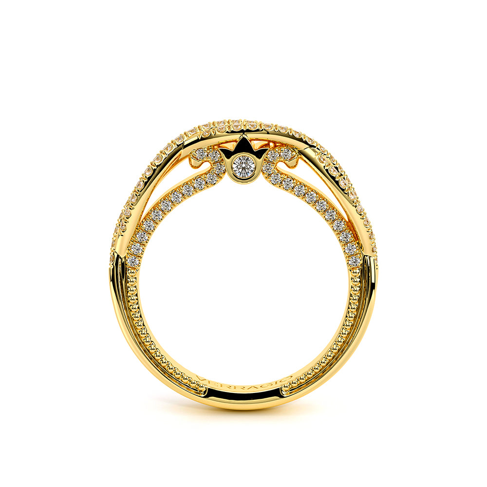COUTURE-0481W features a twisted band from the Couture Collection with round brilliant diamonds, adorned with a Half Diamond Riviera-Signature Beading profile, opt for a twisted band or a straight band to match your Verragio engagement ring.