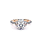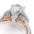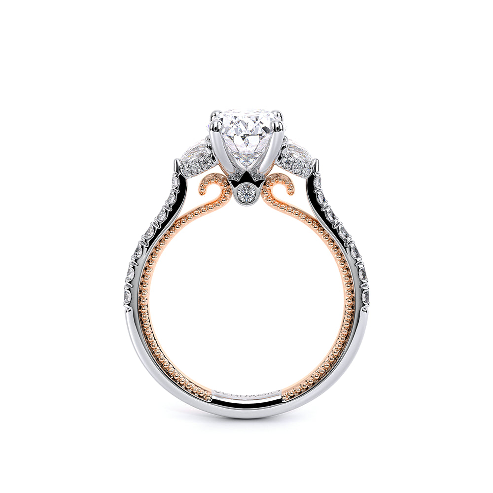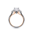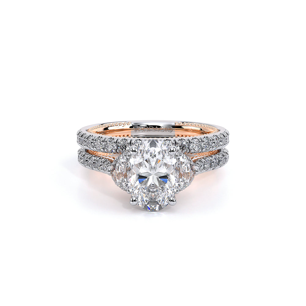 Couture-0485OV is a distinctive three-stone engagement ring featuring half-moon diamond side-stones. The diamond shank is adorned with Verragio signature beading and beautiful scrolls sweep under the center mounting. The Verragio signature crest completes the sophistication of this piece.