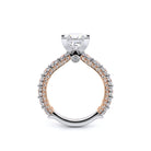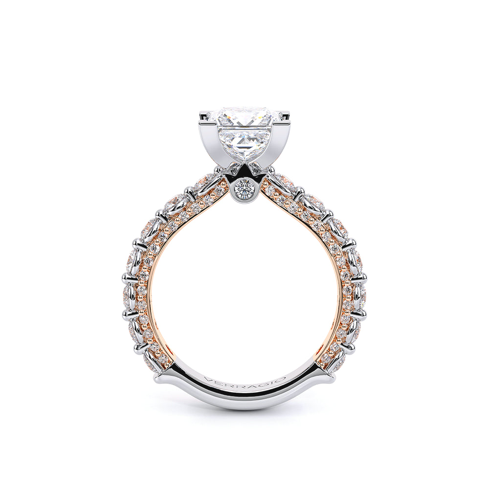 Couture-0488P2.5 is an elevated four-prong engagement setting designed to highlight your center stone. Meticulously-set round diamonds in a shared-prong setting wrap the elegant shank, enhanced with a pave-set three-quarter diamond riviera. This statement look is perfected with the distinctive Verragio signature crest.
