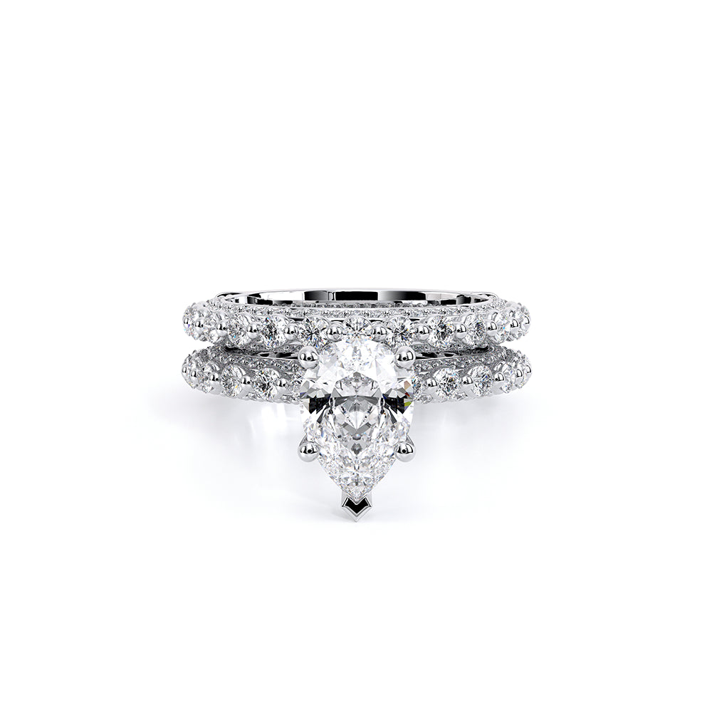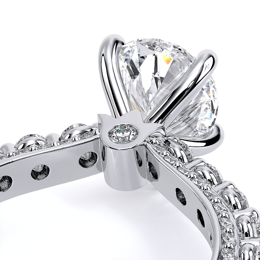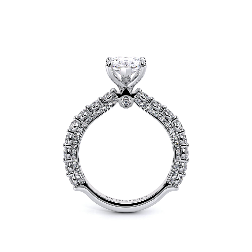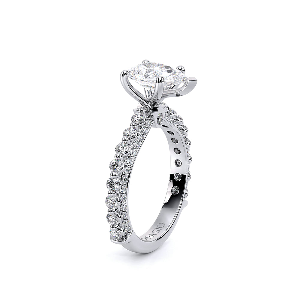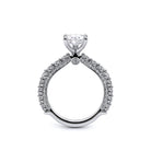 Couture-0488PS20 is an elevated four-prong engagement setting designed to highlight your center stone. Meticulously-set round diamonds in a shared-prong setting wrap the elegant shank, enhanced with a pave-set three-quarter diamond riviera. The Verragio signature crest completes the statement look.
