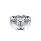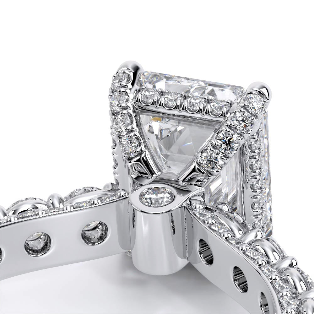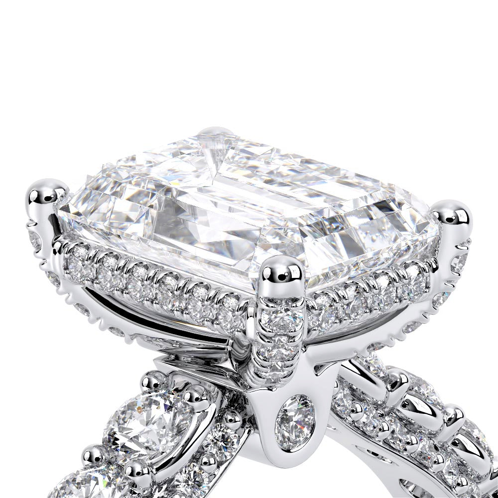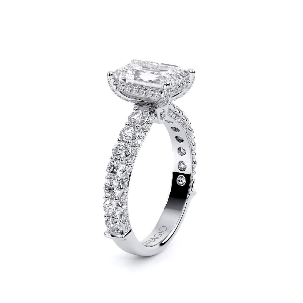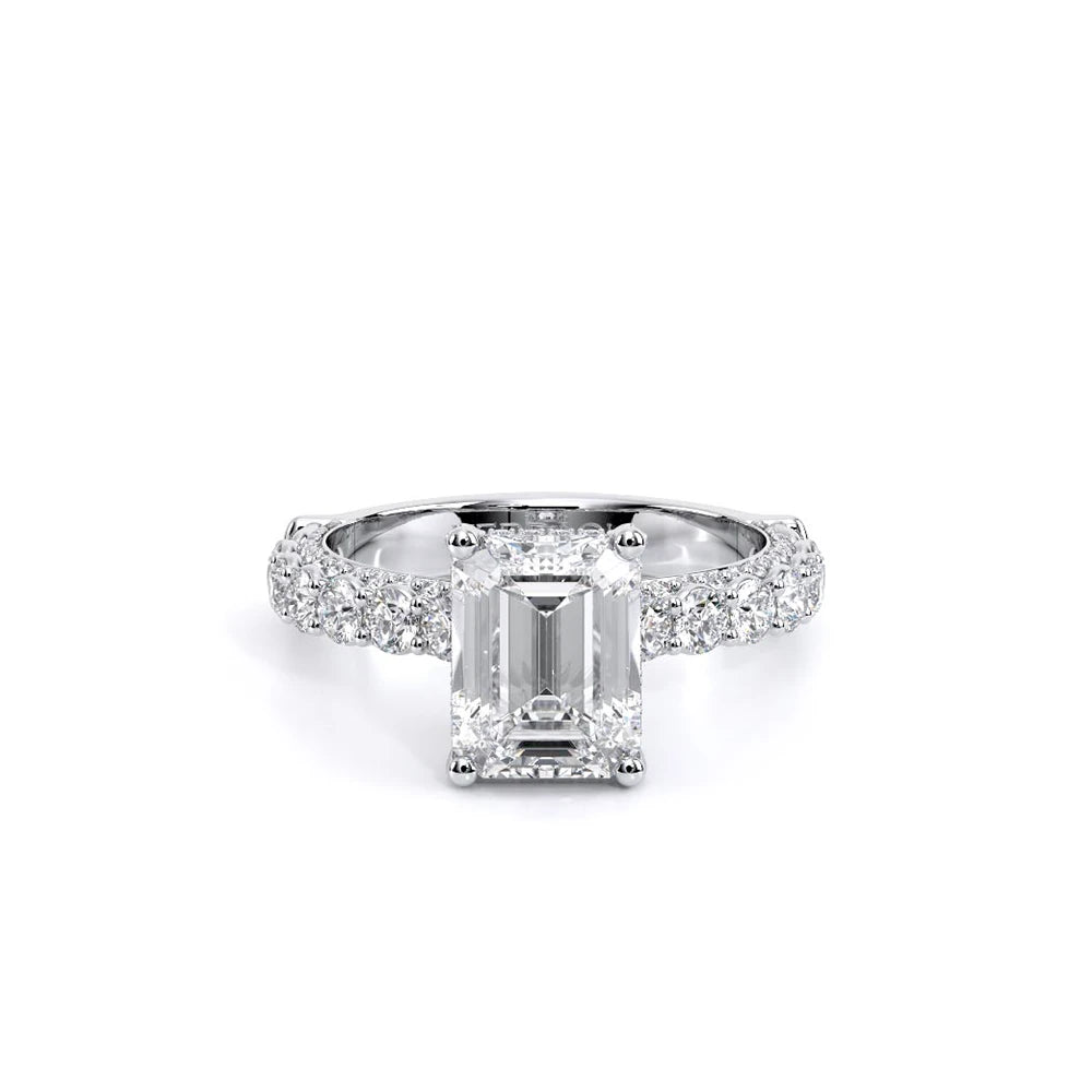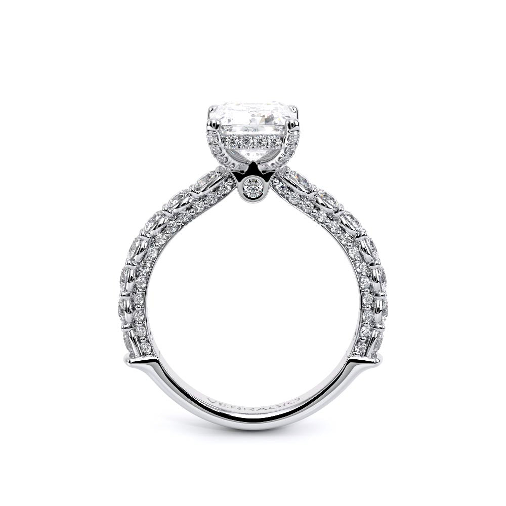 Couture-0489EM-2.5 is an elevated four-prong engagement ring featuring a diamond-bridge head designed to highlight your center stone. Meticulously-set round diamonds in a shared-prong setting wrap the elegant shank, enhanced with a pave-set three-quarter diamond riviera. The Verragio signature crest completes the statement look.