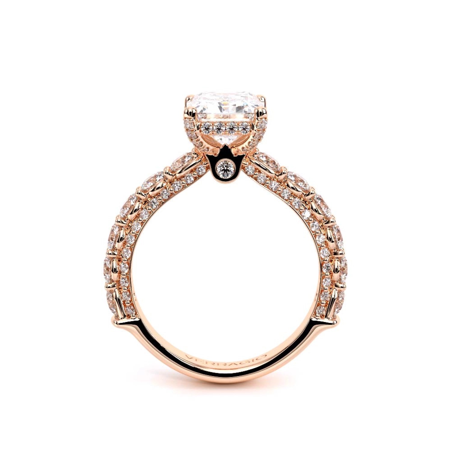 Couture-0489EM-3.0 is an elevated four-prong engagement ring featuring a diamond-bridge head designed to highlight your center stone. Meticulously-set round diamonds in a shared-prong setting wrap the elegant shank, enhanced with a pave-set three-quarter diamond riviera. The Verragio signature crest completes the statement look.