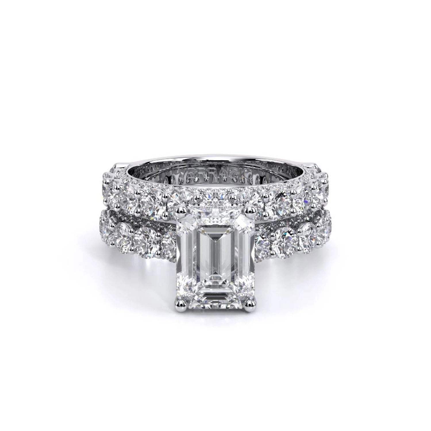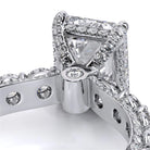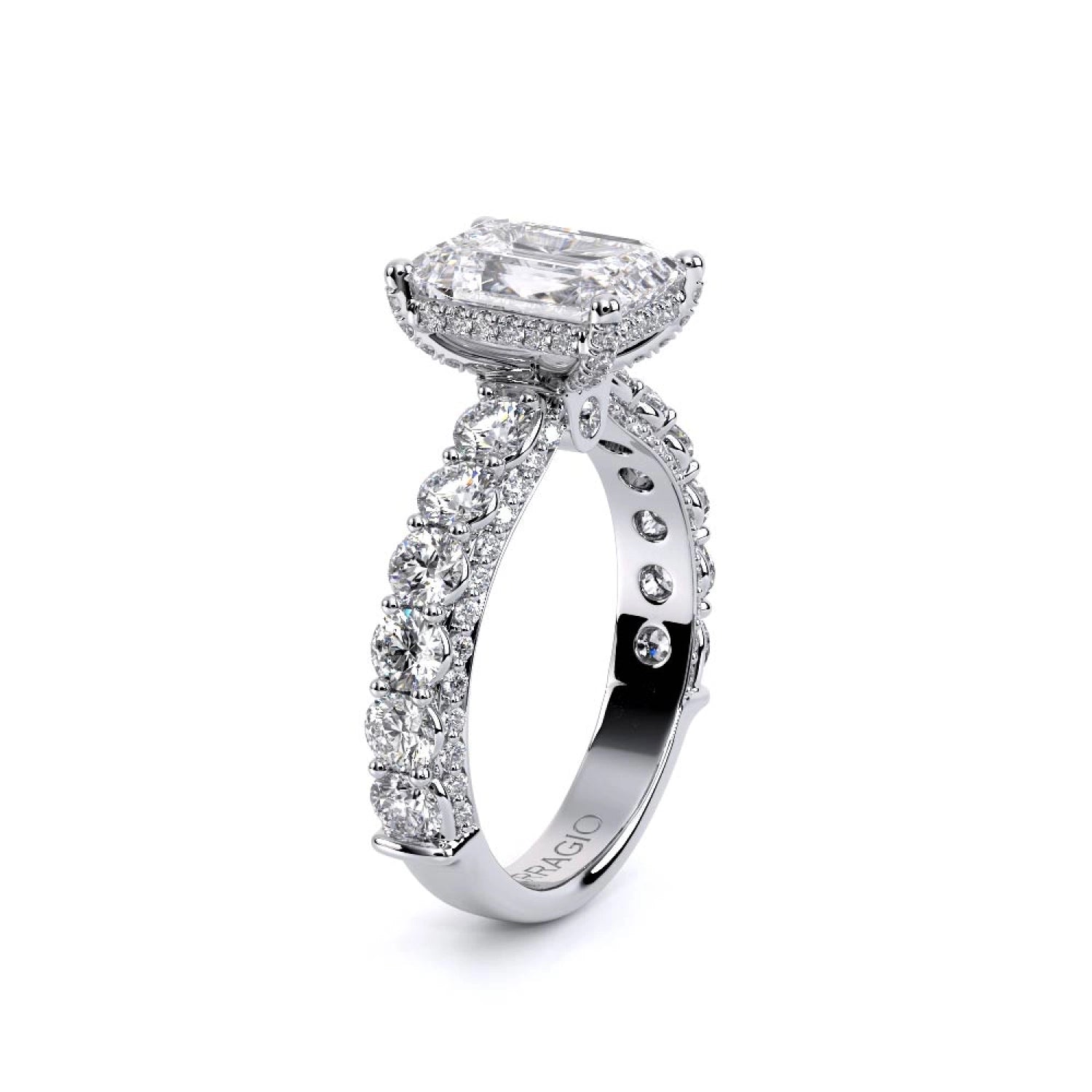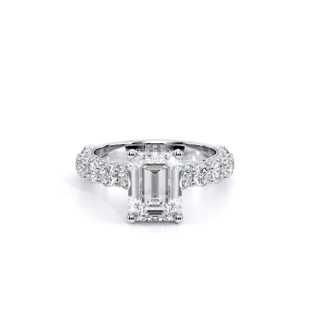 Couture-0489EM-3.0 is an elevated four-prong engagement ring featuring a diamond-bridge head designed to highlight your center stone. Meticulously-set round diamonds in a shared-prong setting wrap the elegant shank, enhanced with a pave-set three-quarter diamond riviera. The Verragio signature crest completes the statement look.