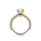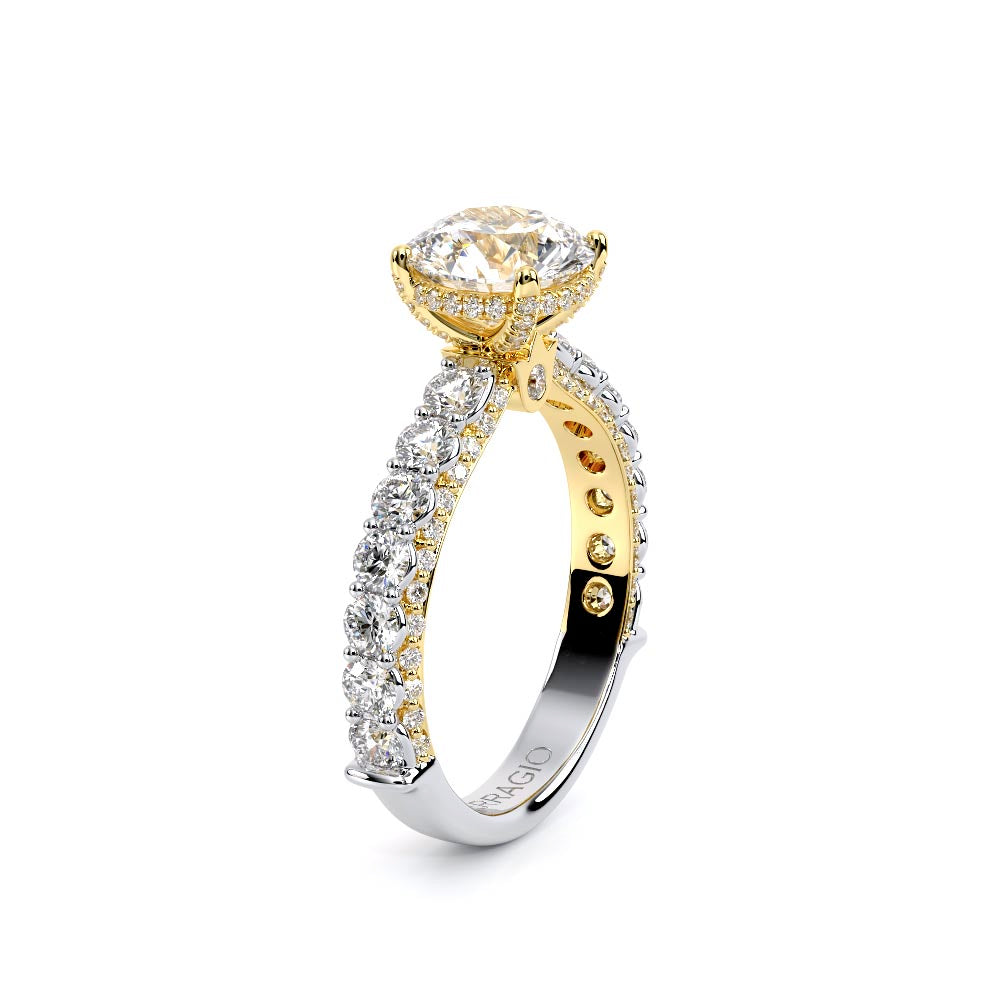 Couture-0489R-2.5 is an elevated four-prong engagement ring featuring a diamond-bridge head designed to highlight your center stone. Meticulously-set round diamonds in a shared-prong setting wrap the elegant shank, enhanced with a pave-set three-quarter diamond riviera. The Verragio signature crest completes the statement look.