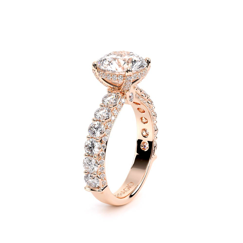 Couture-0489R-3.0 is an elevated four-prong engagement ring featuring a diamond-bridge head designed to highlight your center stone. Meticulously-set round diamonds in a shared-prong setting wrap the elegant shank, enhanced with a pave-set three-quarter diamond riviera. The Verragio signature crest completes the statement look.