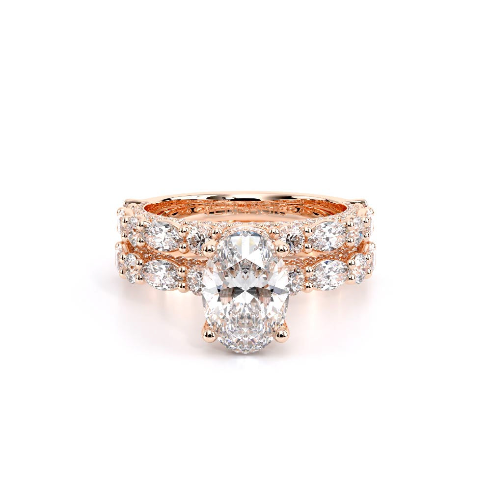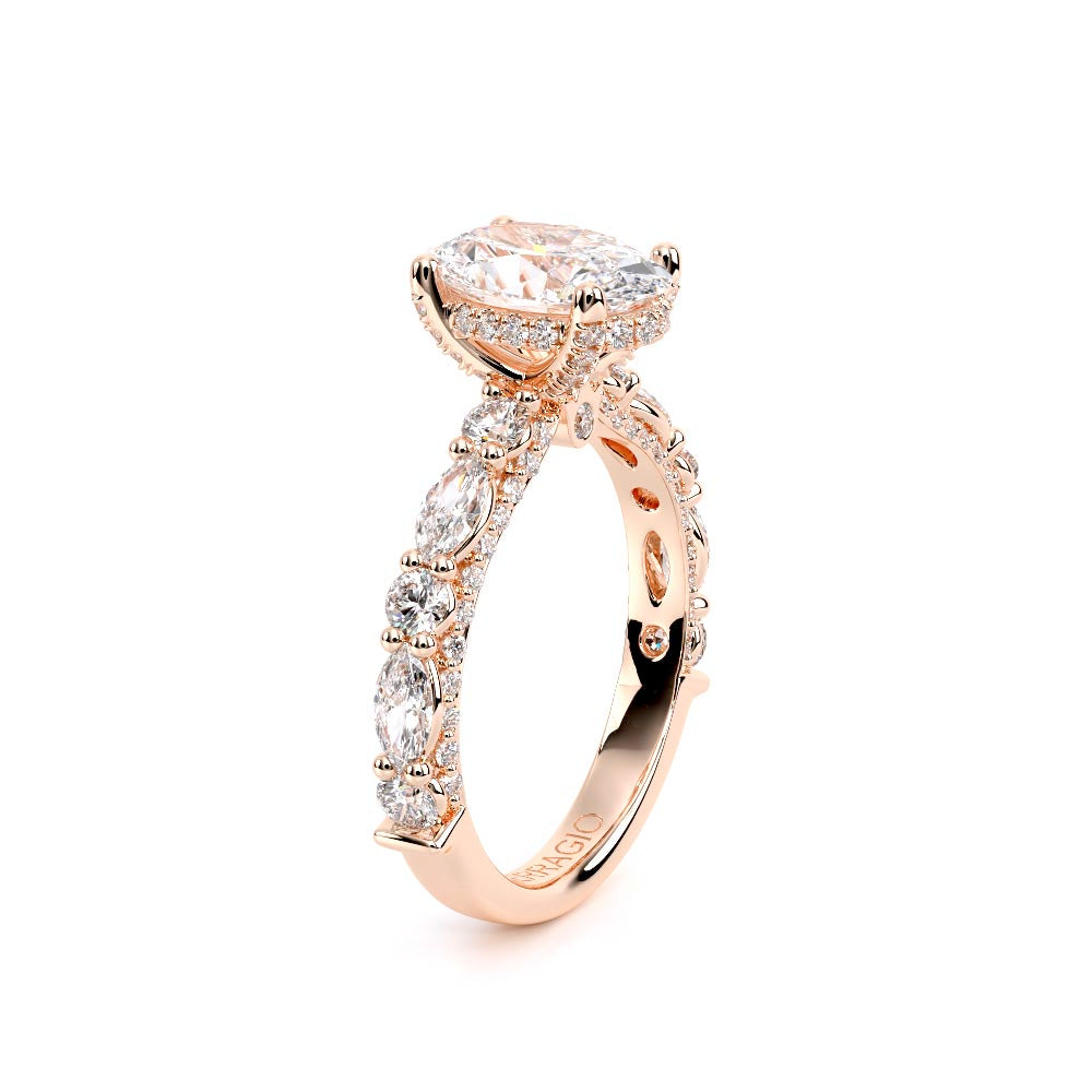Couture-0490OV-2.5 is an elevated four-prong engagement ring featuring a diamond-bridge head designed to highlight your center stone. Meticulously-set alternating round and marquise diamonds in a shared-prong setting wrap the elegant shank, enhanced with a pave-set three-quarter diamond riviera. The Verragio signature crest completes the statement look.