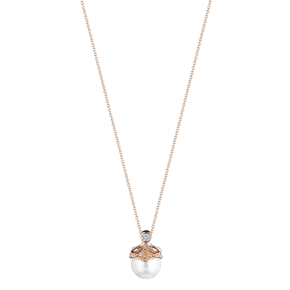 Elevate your style with this exquisite Reverie Floret Cap Pearl Pendant. Rich 18k rose gold plus a luminous pearl make for a timeless Victorian look with the classic Verragio Floret halo.