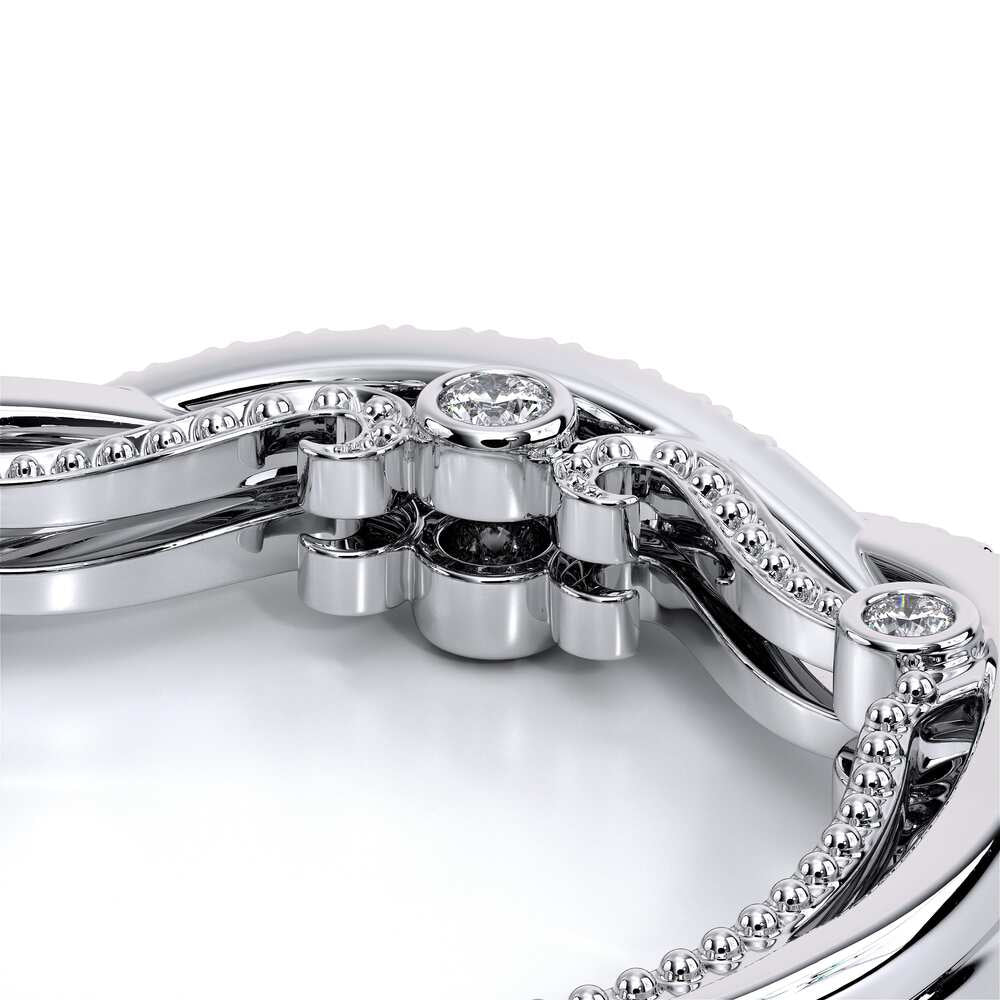 INSIGNIA-7070W diamond wedding ring from the Insignia Collection, featuring round brilliant-cut diamonds pave set on a twisted band. Unique with bezel set diamonds with distinguishing Insignia Scrollwork accompanied by Verragio's timeless signature beading and crest.