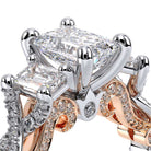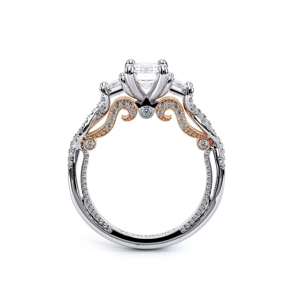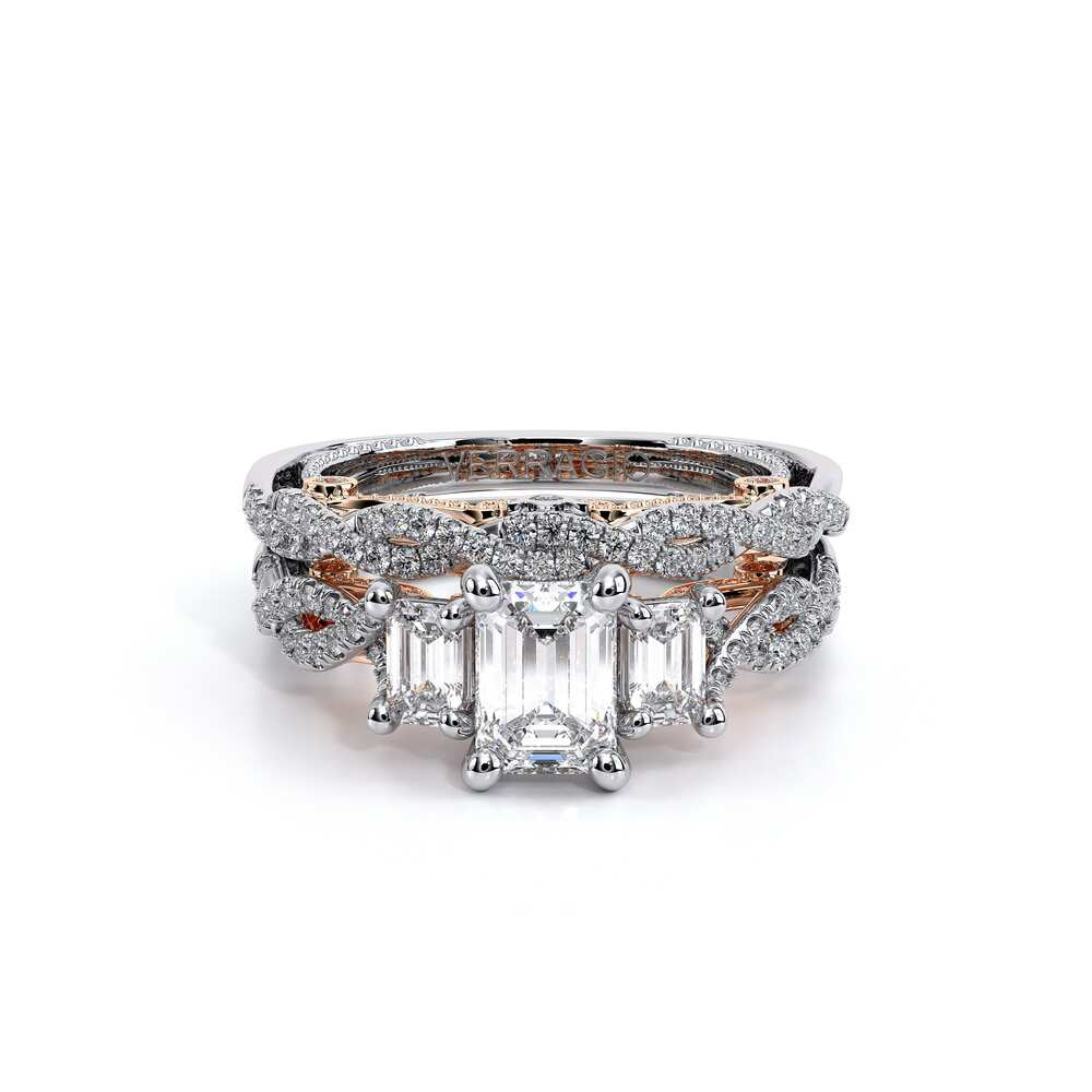 INSIGNIA-7074EM Three stone diamond engagement ring adorned with Verragio's signature beading, pave set brilliant-cut diamonds on Insignia's handcrafted scrollwork and twisted band. Refined to enhance a Emerald diamond center.