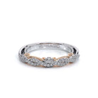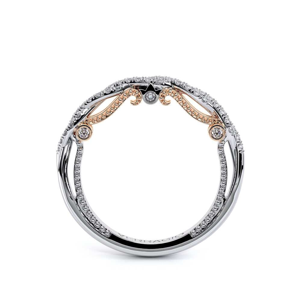 INSIGNIA-7074W wedding ring from the Insignia Collection, featuring round brilliant-cut diamonds pave set on a twisted band. Unique with bezel set diamonds with distinguishing Insignia Scrollwork accompanied by Verragio's signature crest and beading.