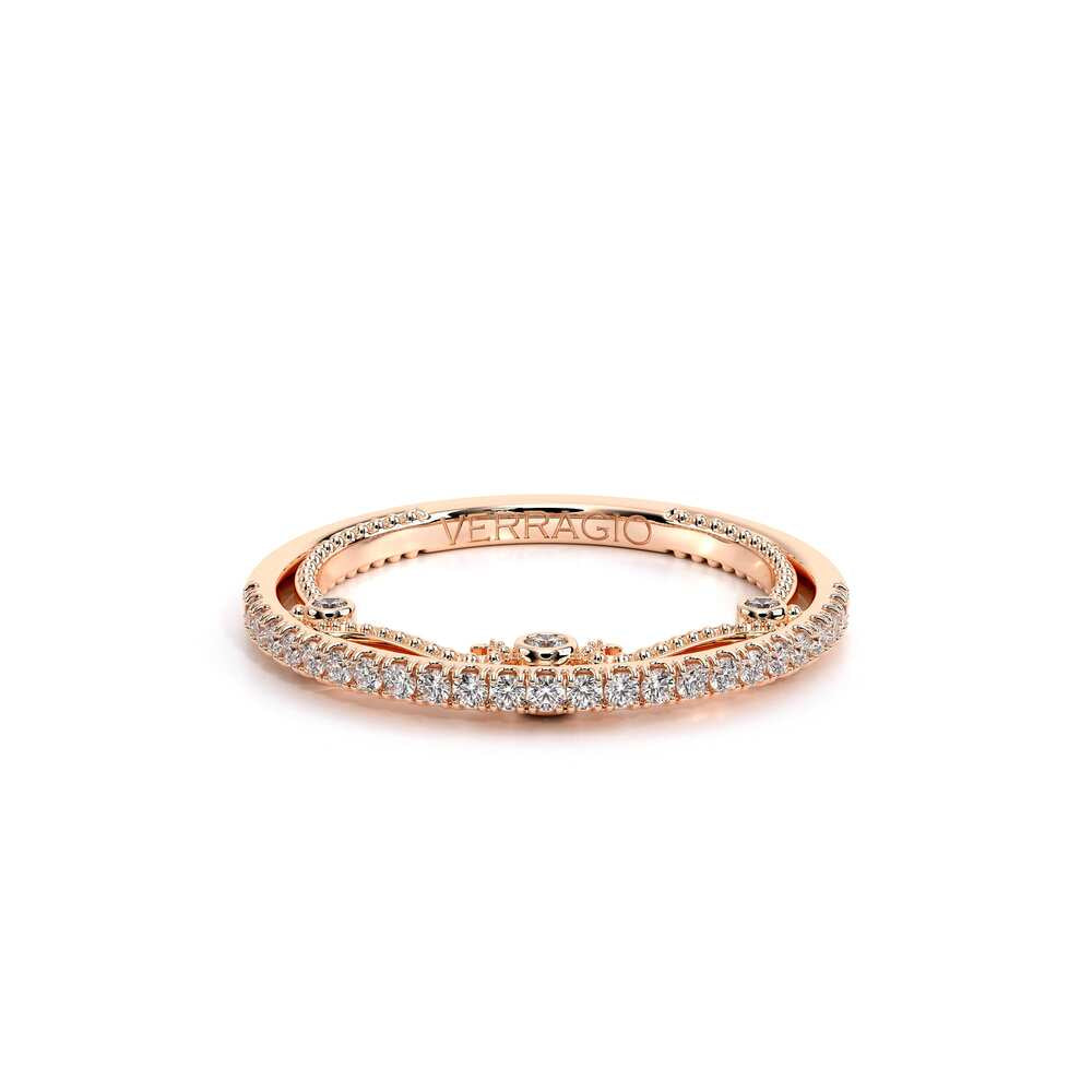 INSIGNIA-7087WSB diamond wedding ring from the Insignia Collection, featuring round brilliant-cut diamonds pave set on a straight band. Unique with bezel set diamonds with distinguishing Insignia Scrollwork accompanied by Verragio's signature beading.