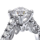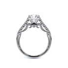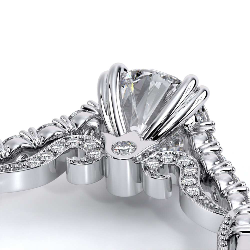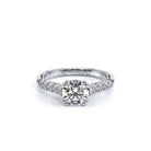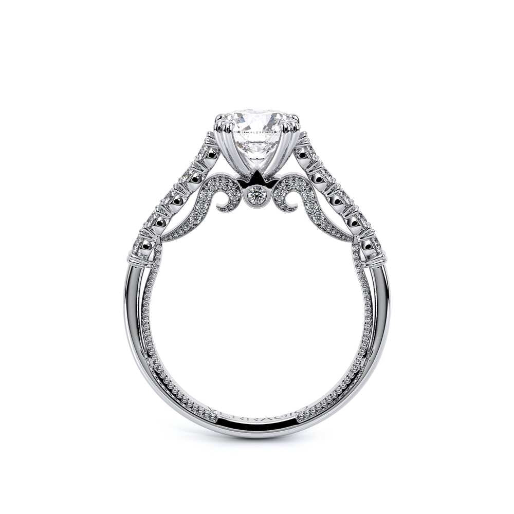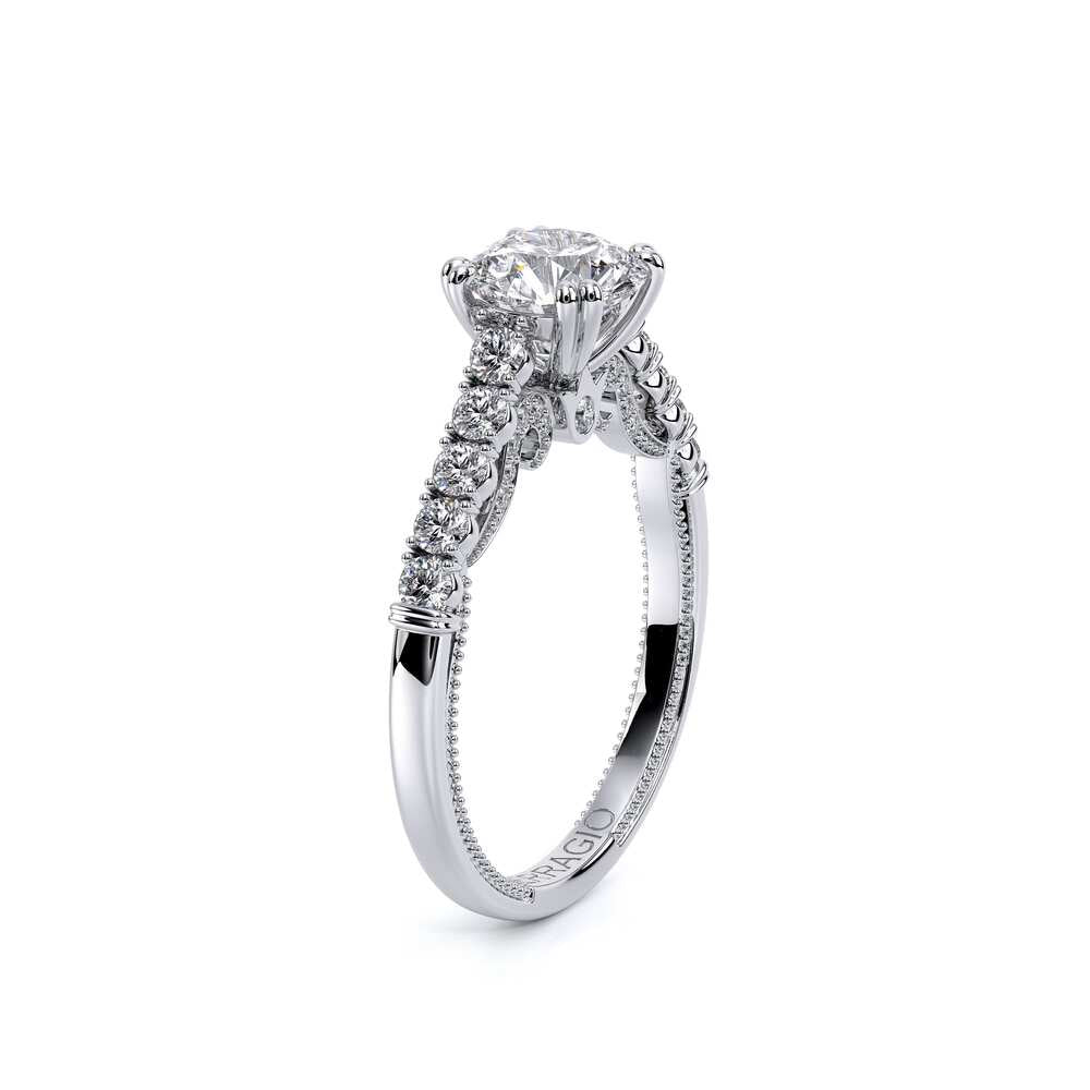 INSIGNIA-7097R Classic engagement ring features a shared-prong set band with round brilliant-cut diamonds. Meticulously set and handcrafted is Insignia's scrollwork which seamlessly flows into Verragio's signature beading and crest.