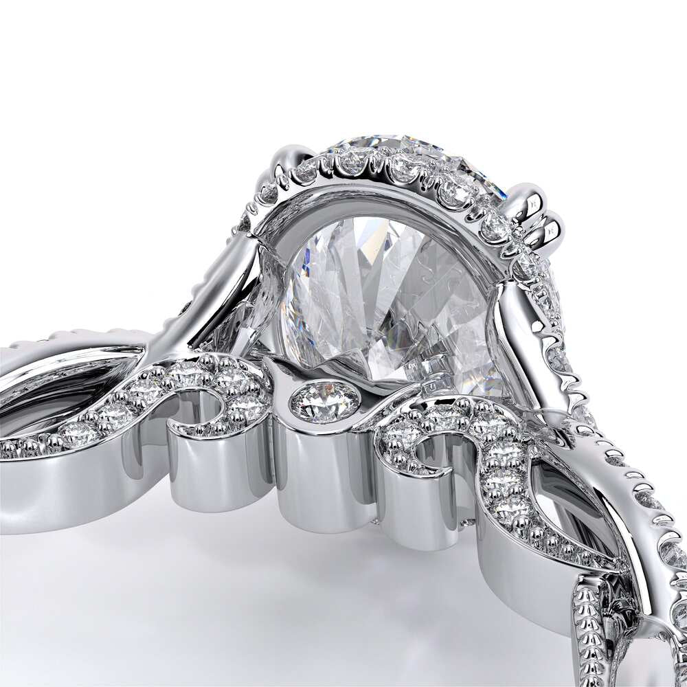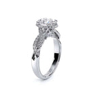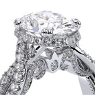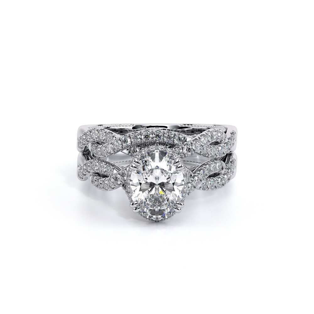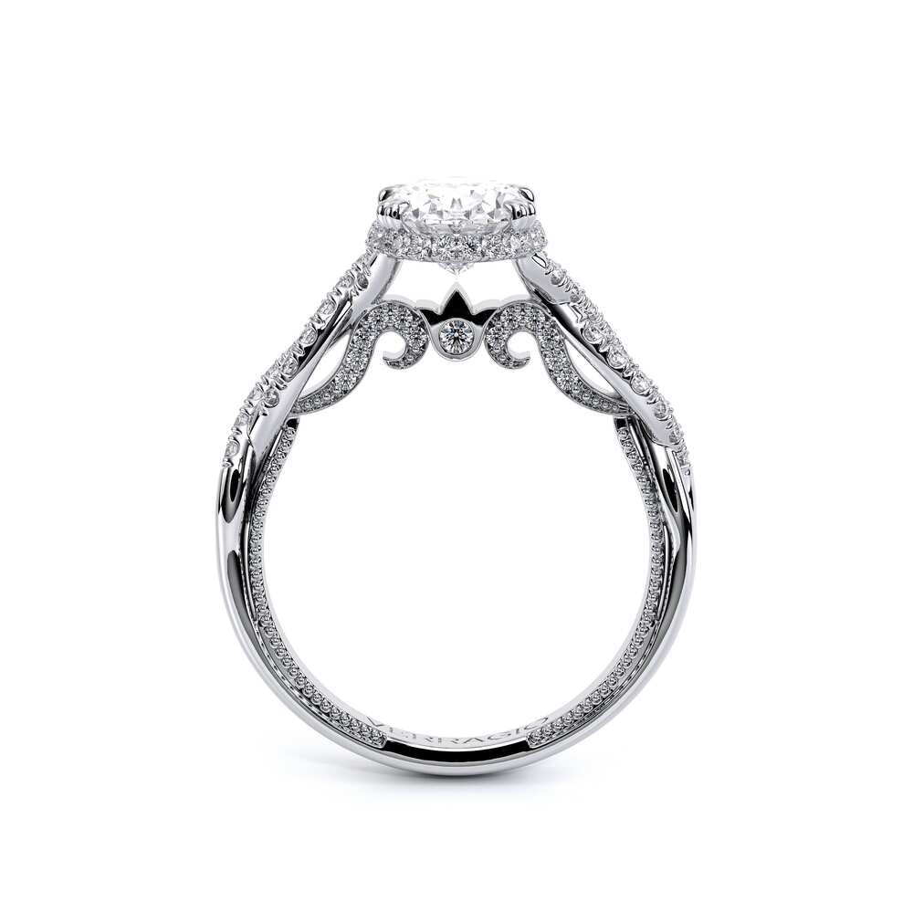 INSIGNIA-7099OV oval engagement ring featuring Verragio's handcrafted stardust halo adorned with meticulously set round brilliant-cut diamonds atop a twisted band. Accompanying diamond Insignia scrollwork refined with Verragio's timeless signature crest and beading.
