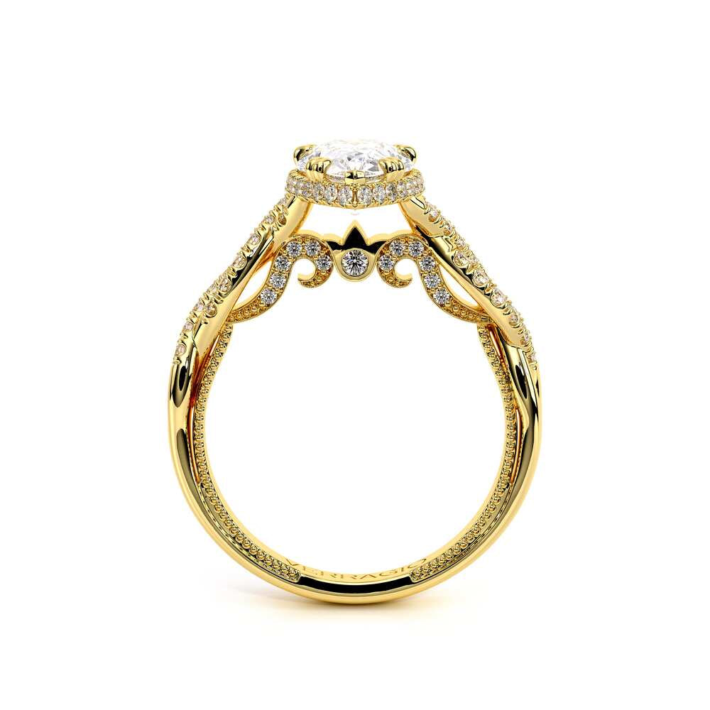 INSIGNIA-7099PS Pear engagement ring featuring Verragio's handcrafted stardust halo adorned with meticulously set round brilliant-cut diamonds atop a twisted band. Accompanying diamond Insignia scrollwork refined with Verragio's timeless signature crest and beading.