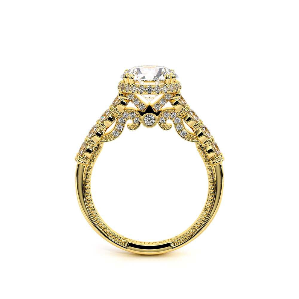INSIGNIA-7100R Accentuates your Round engagement ring with a pave set stardust halo illuminated by round brilliant-cut diamonds. Featuring, a shared-prong set band and handcrafted Insignia's scrollwork. Refined by Verragio's signature beading and crest.