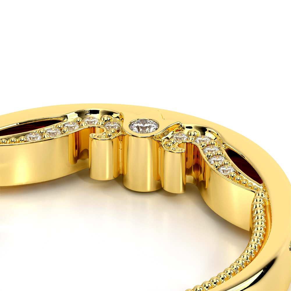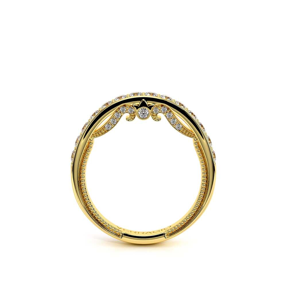 INSIGNIA-7103W diamond wedding ring from the Insignia Collection, featuring round brilliant-cut diamond channel set on a straight band. Adorned with handcrafted diamond Insignia Scrollwork accompanied by Verragio's timeless signature crest and beading.