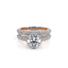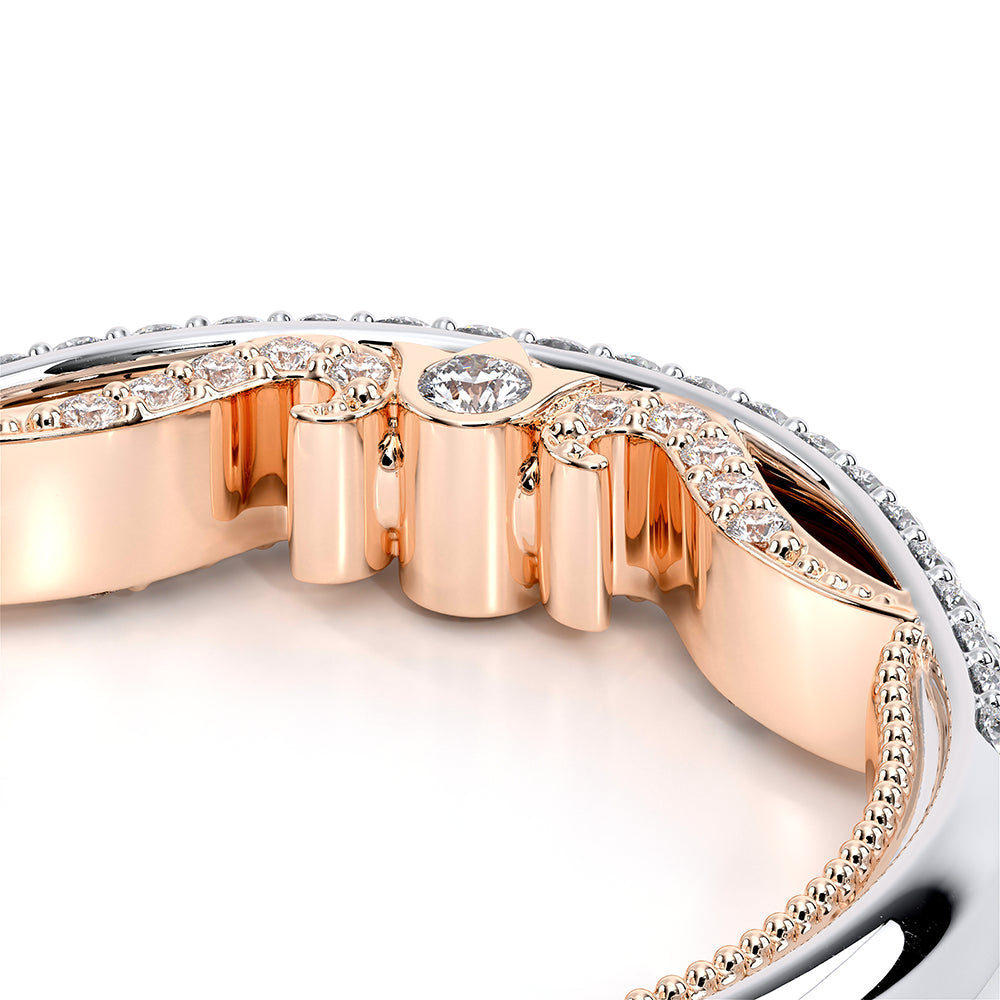 INSIGNIA- 7105W is a testament to timeless elegance, featuring two rows of meticulously set pave diamonds that gracefully encircle the band. Crafted with precision adorned with our signature Insignia scrollwork, Verragio crest, and beading.