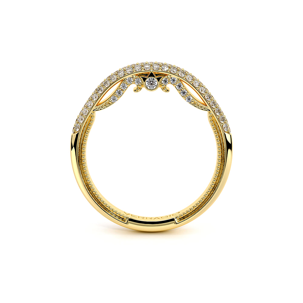 INSIGNIA- 7105W is a testament to timeless elegance, featuring two rows of meticulously set pave diamonds that gracefully encircle the band. Crafted with precision adorned with our signature Insignia scrollwork, Verragio crest, and beading.