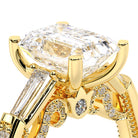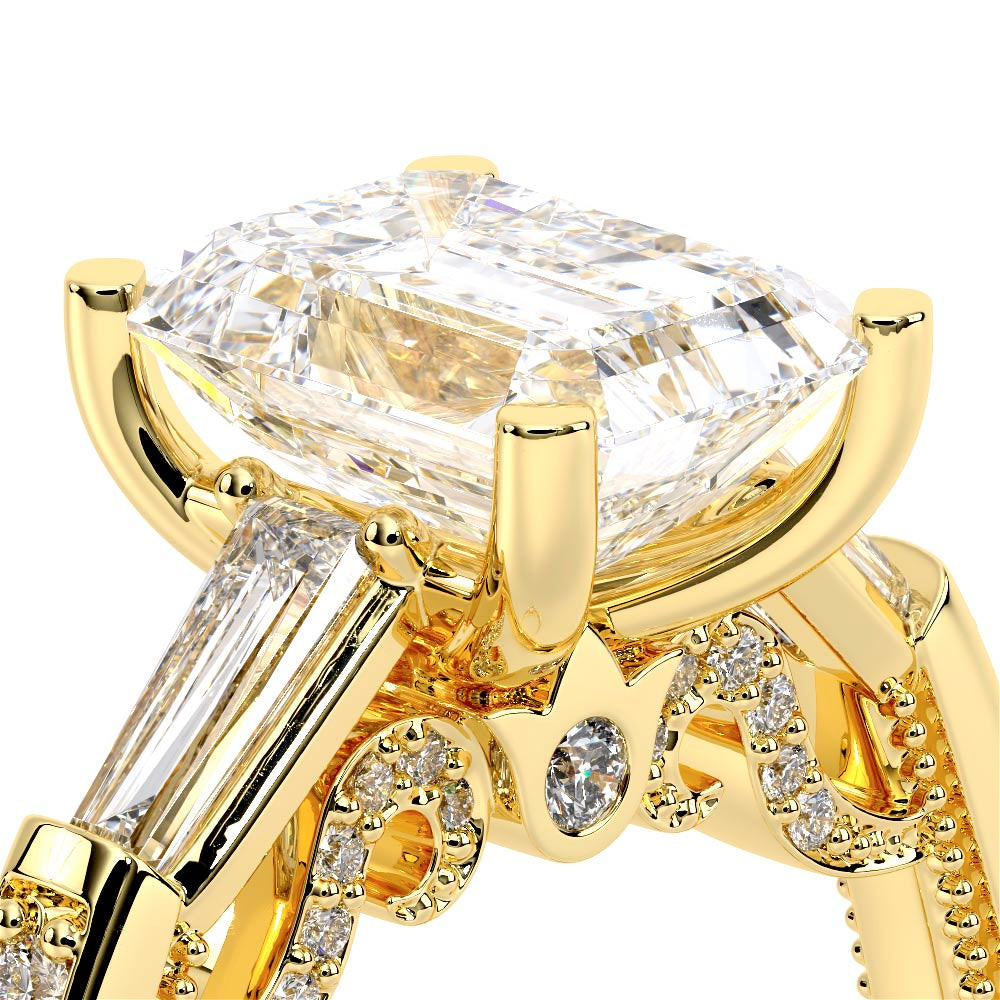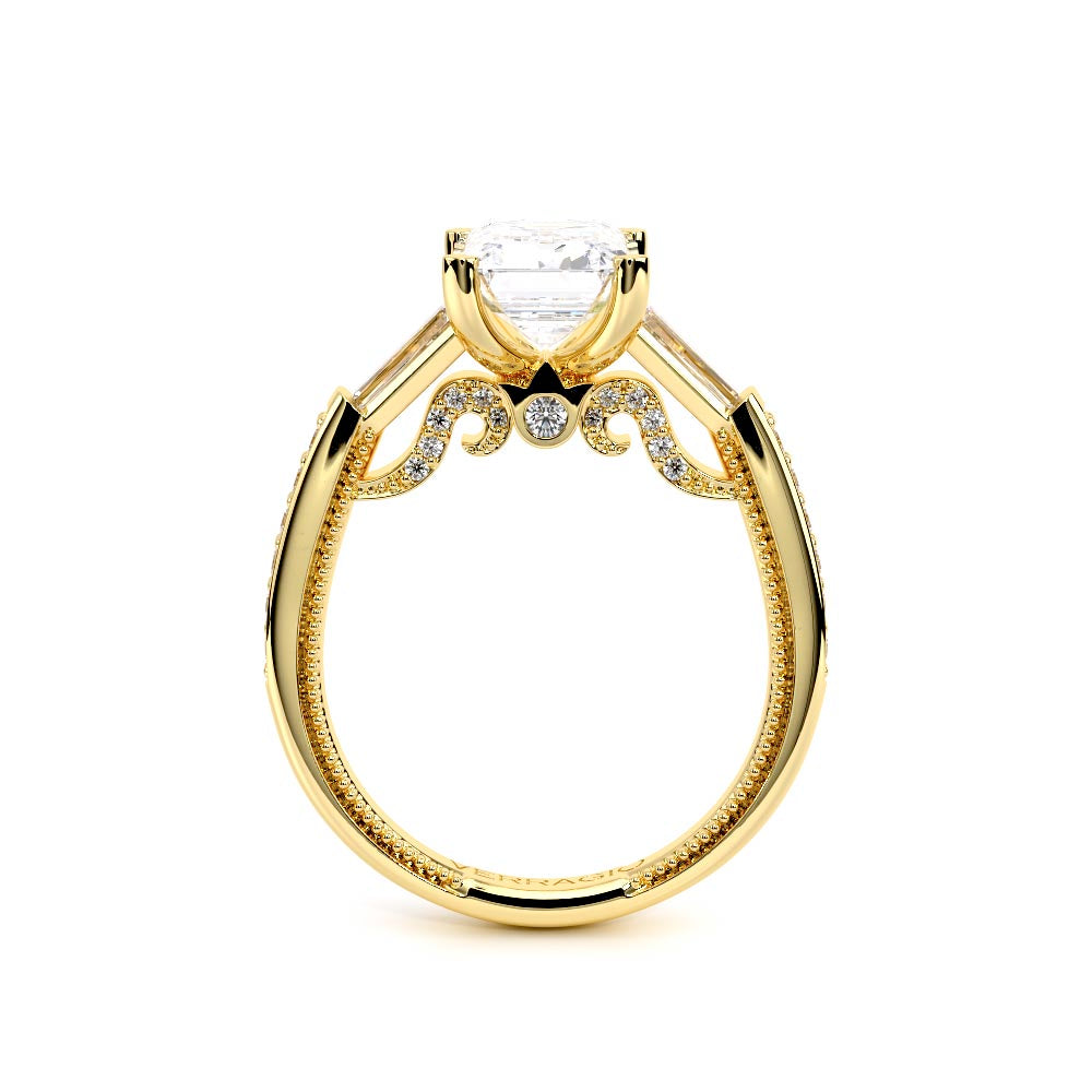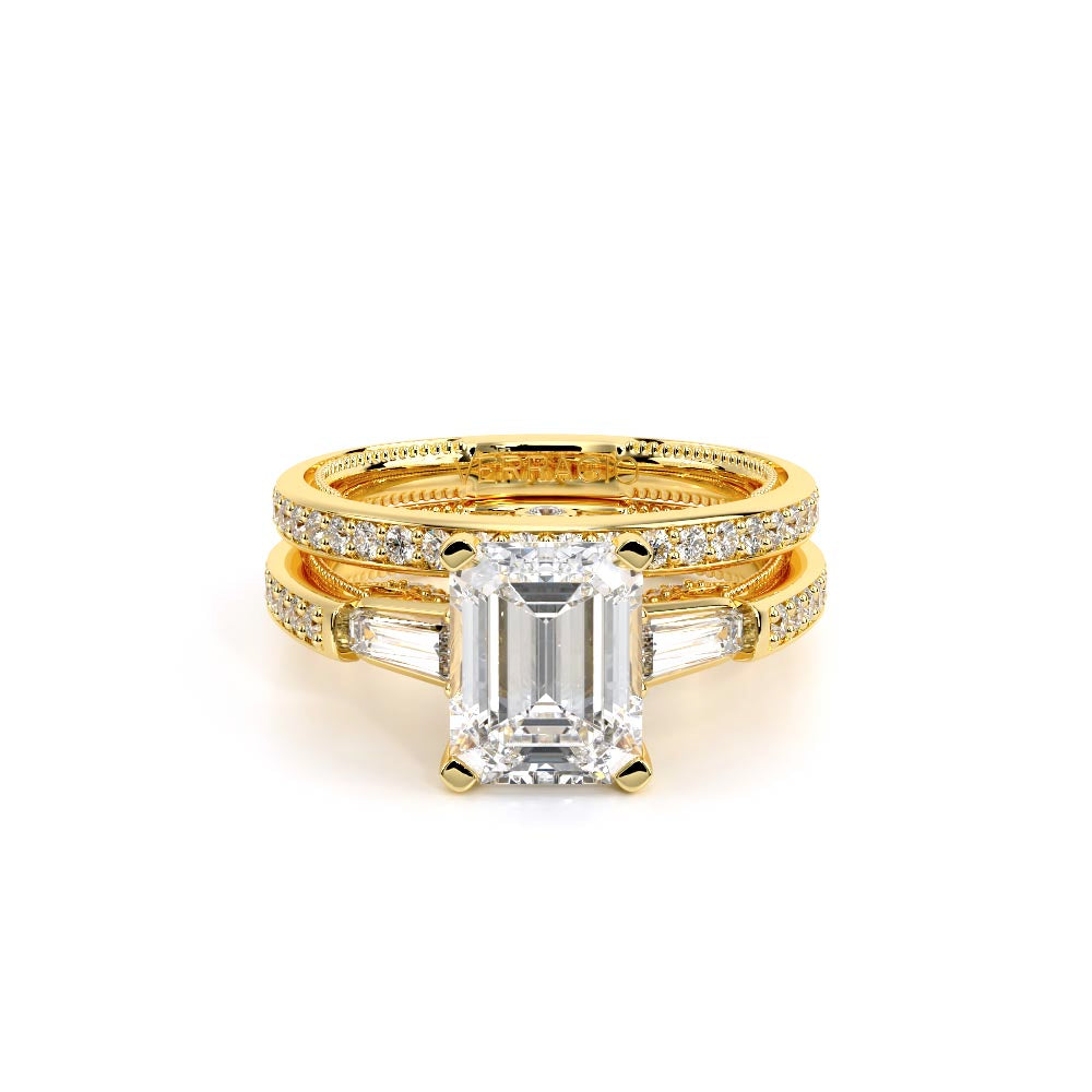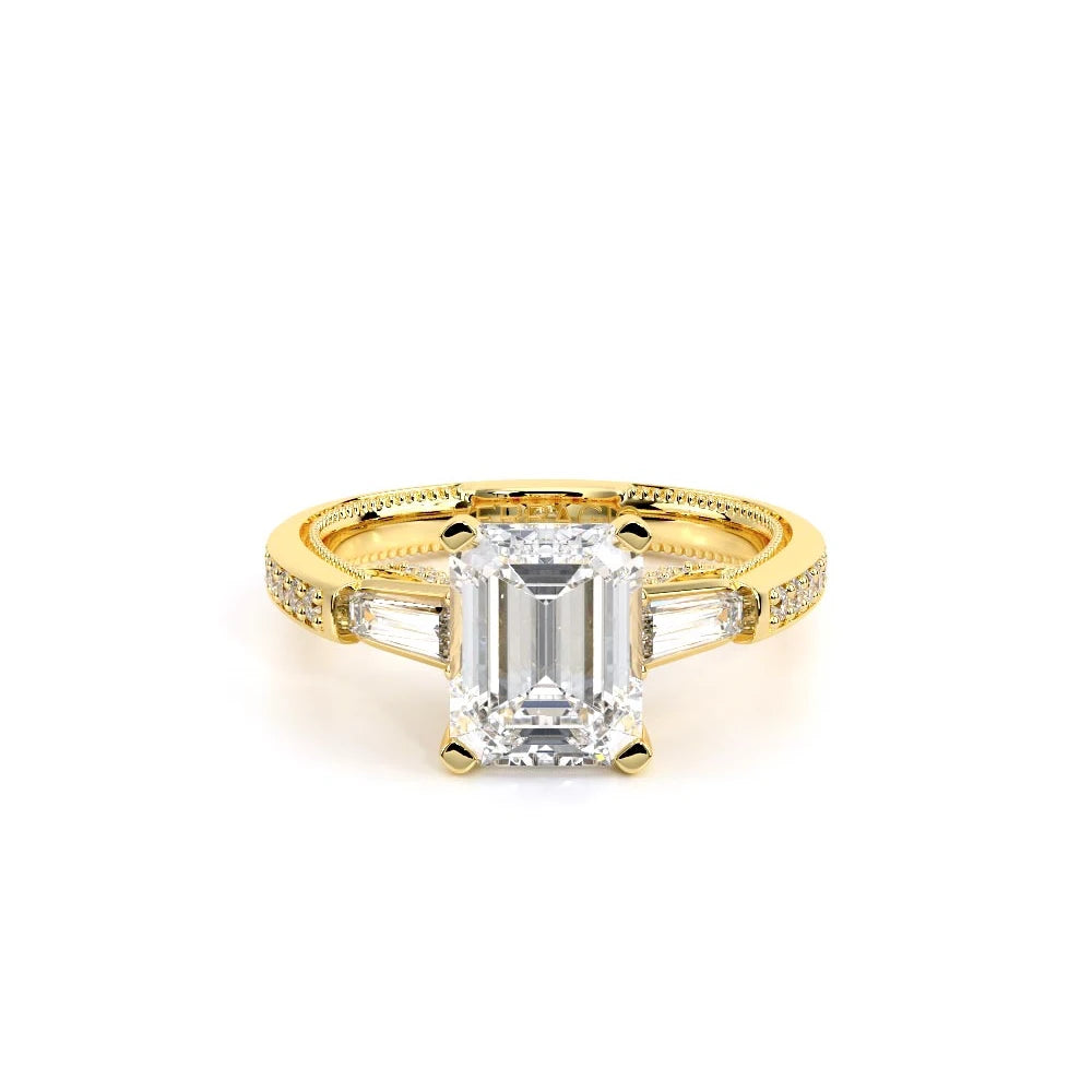 Insignia-7110EM is a enchanting three-stone engagement ring featuring baguette diamond side-stones. Atop a band embellished with round brilliant-cut diamonds, the ring showcases Insignia's bold diamond scrollwork, seamlessly uniting Verragio's iconic crest and signature beading.
