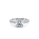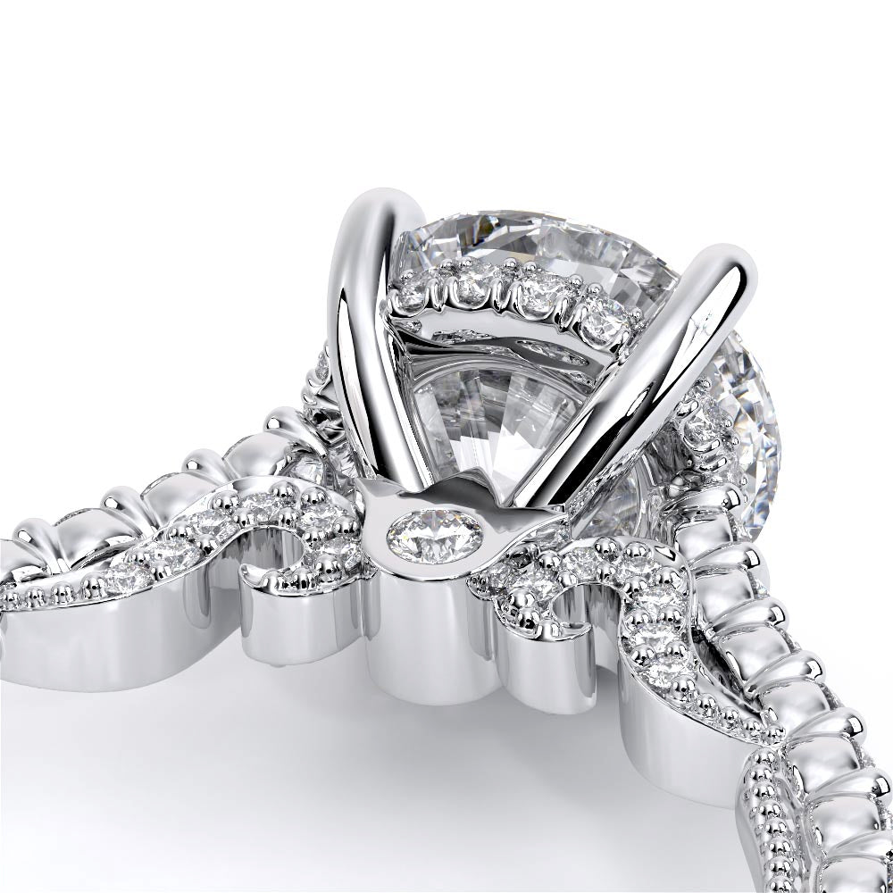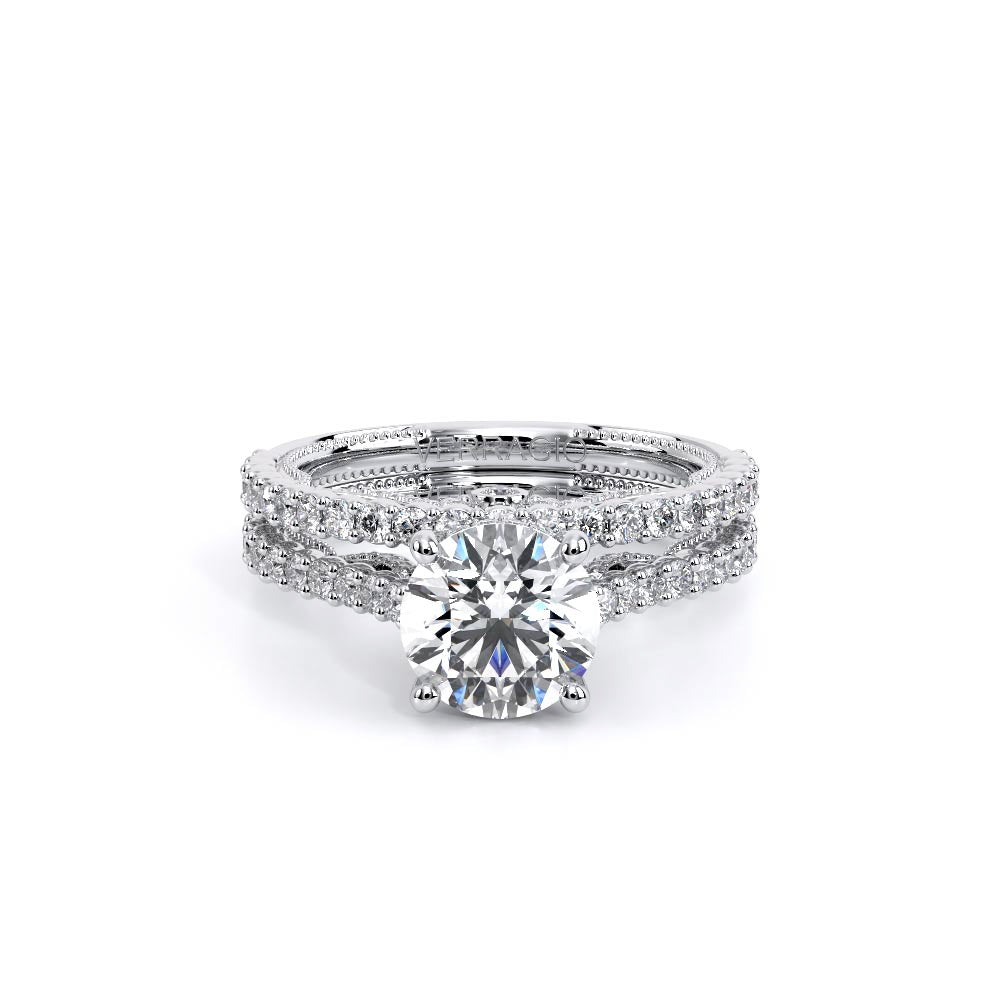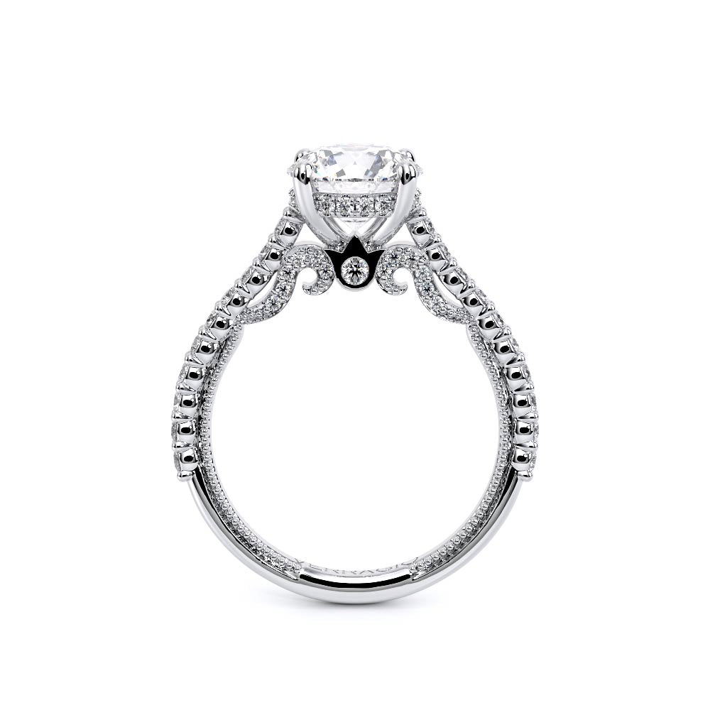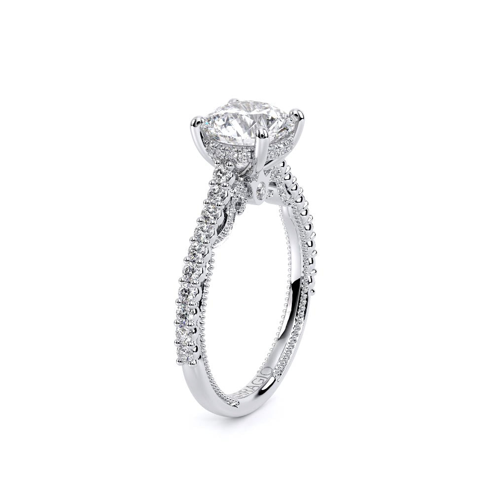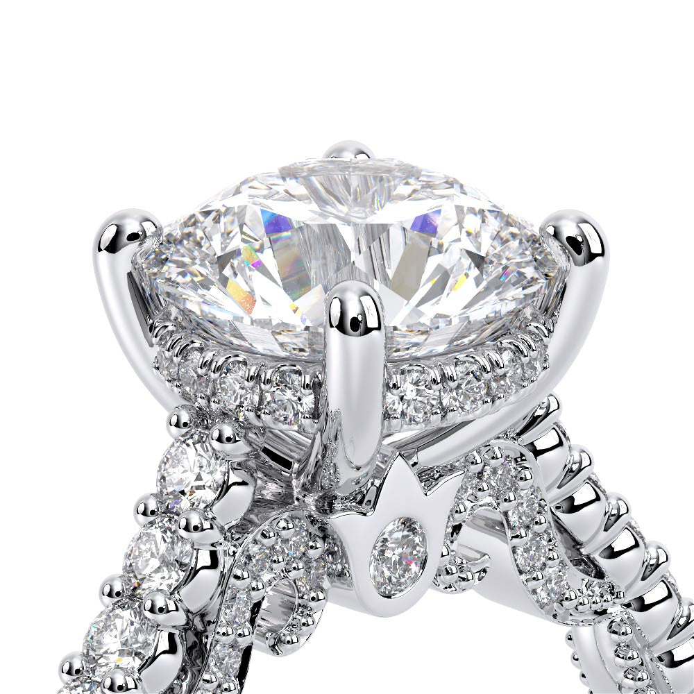 The INSIGNIA-7111R is a classically-evolved engagement ring, featuring pave-set diamonds to encircle and elevate any center stone. Atop a band embellished with round brilliant-cut diamonds, the ring showcases Insignia's bold diamond scrollwork, seamlessly uniting Verragio's iconic crest and signature beading.